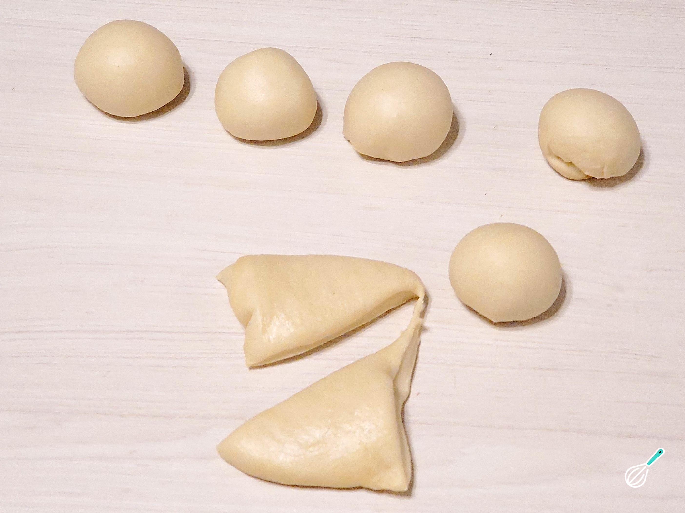 Terminado o tempo de descanso da massa, divida-a em 8 pedaços do mesmo tamanho e enrole-os em bolas.