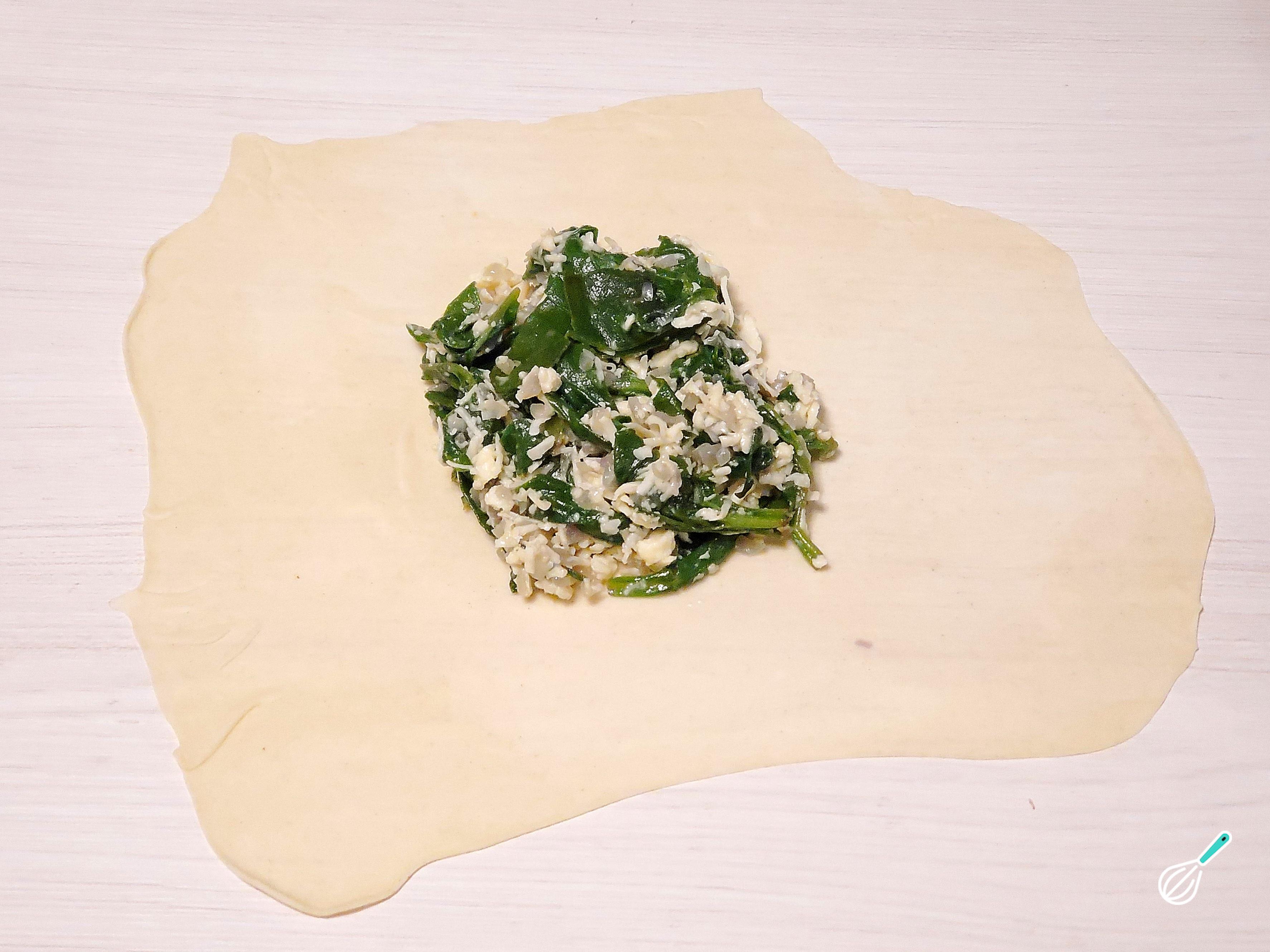 No meio coloque algumas colheres de sopa do recheio e espalhe dando-lhe uma forma quadrada.