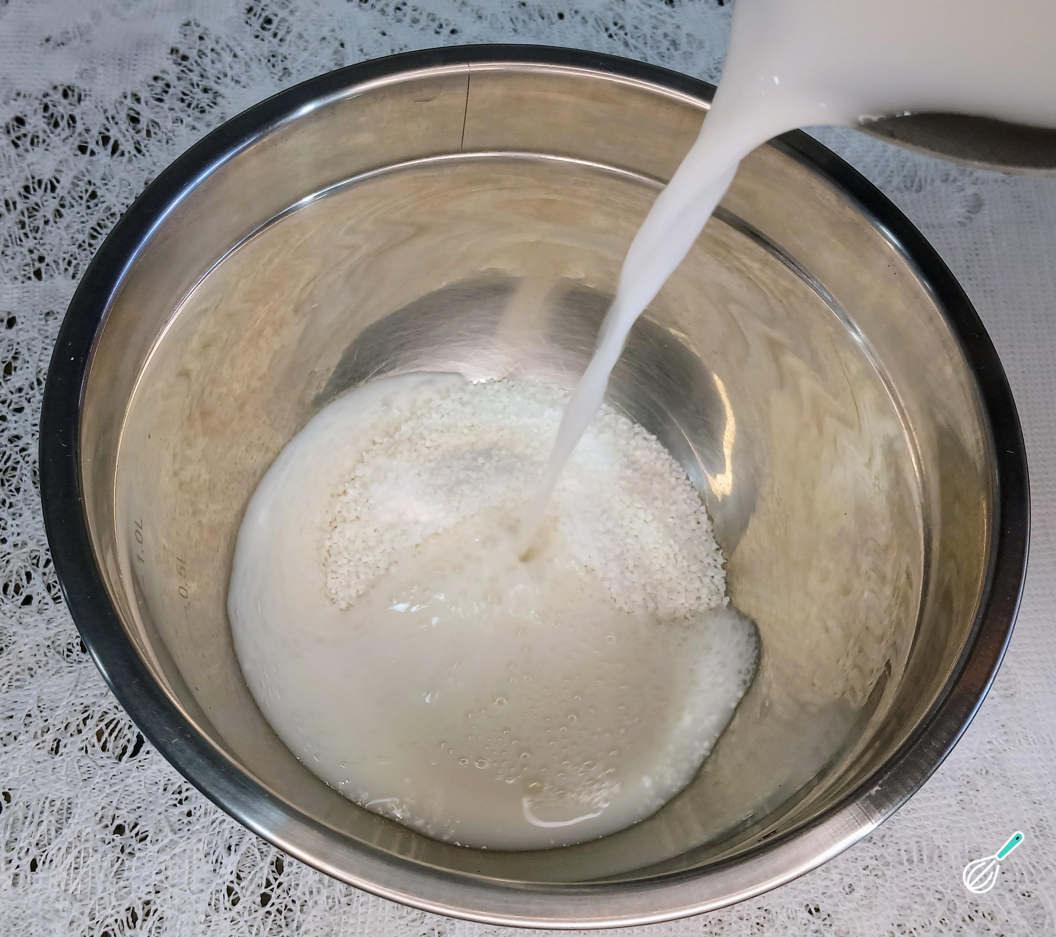 Depois de separar os ingredientes, coloque o leite vegetal em uma leiteira e deixe que morne. O leite precisa estar morno para hidratar a tapioca, não precisa ferver.