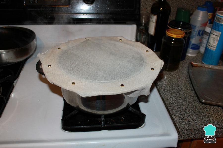 Leve ao fogo uma panela com água e espere ferver. Prenda a escumilha no aro de costura e encaixe-o sobre a panela (para isso, a panela deverá ter um diâmetro menor que o aro).