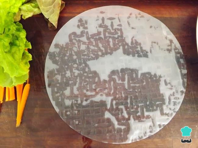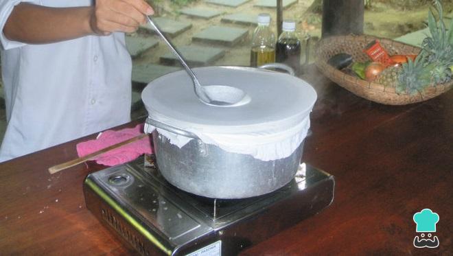Verta cuidadosamente uma pequena porção da pasta de papel de arroz sobre a escumilha, espalhe com uma espátula e deixe que receba o vapor da água fervente por 3 minutos. O ideal é obter uma camada bem fina de papel de arroz.