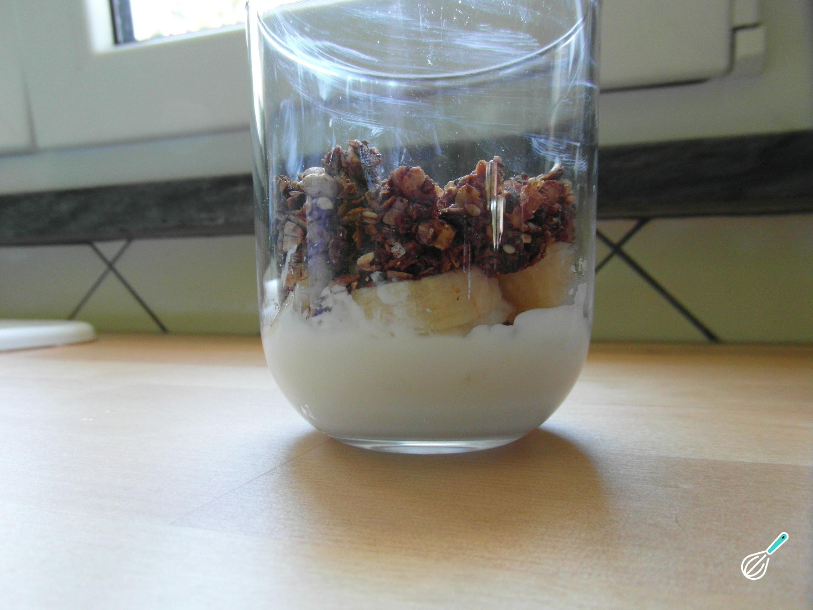 Cubra o iogurte com algumas rodelas de banana, esta é a segunda camada do parfait de iogurte com frutas e granola.