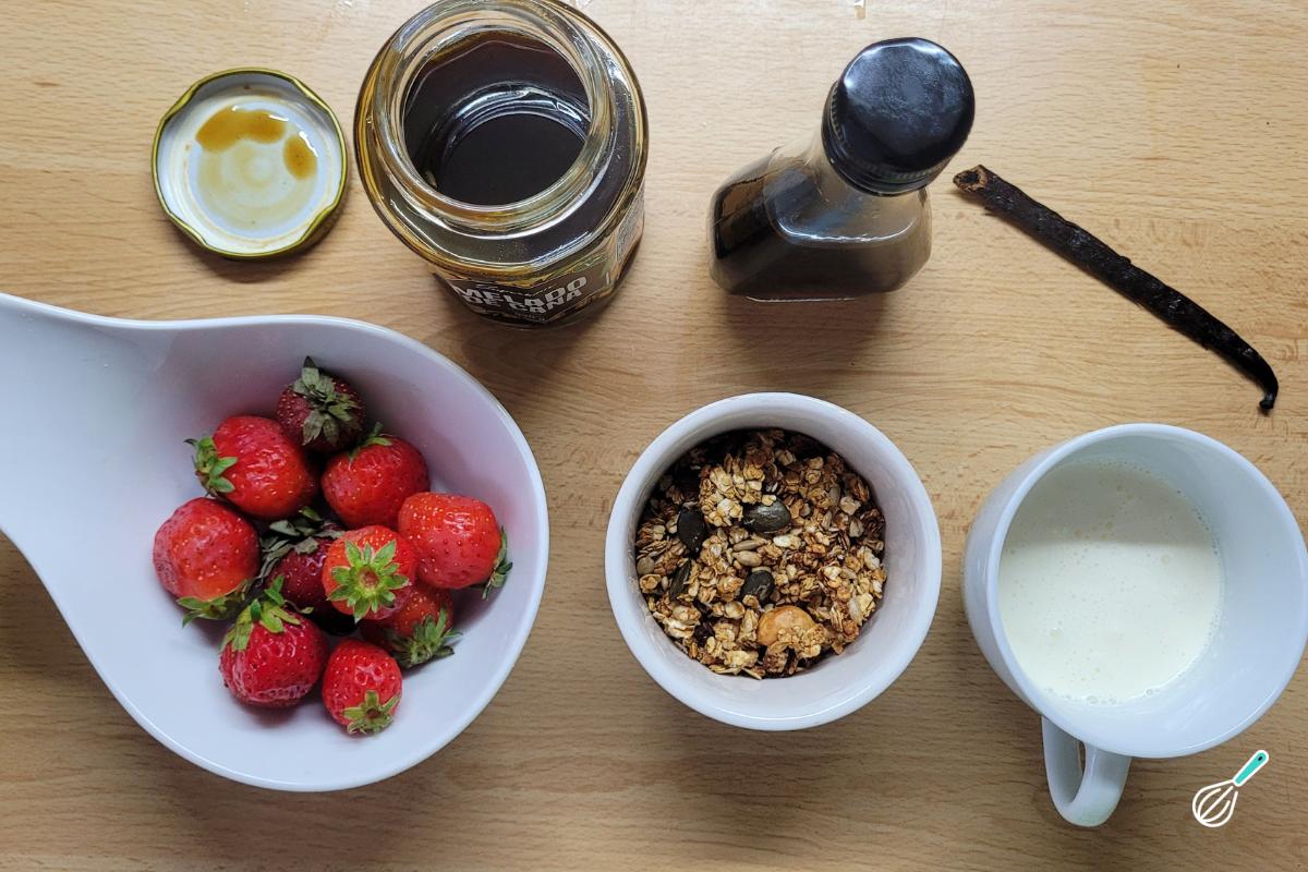Separe os ingredientes para fazer seu parfait de morango. Essa sobremesa é bem versátil e alguns ingredientes podem ser adaptados conforme a sua preferência.