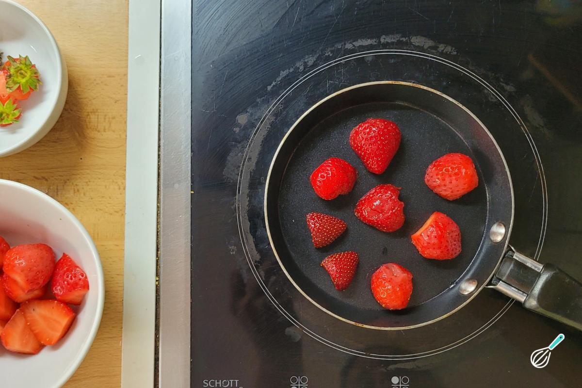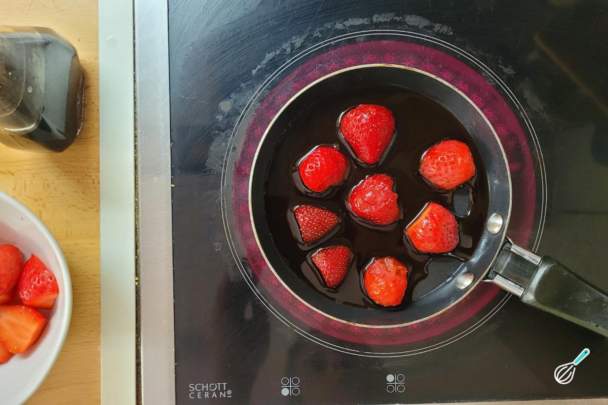 Essa compota é super rápida e prática. Regue os morangos com o vinagre balsâmico, ligue em fogo médio-baixo e deixe que os morangos comecem a ficar molinhos.