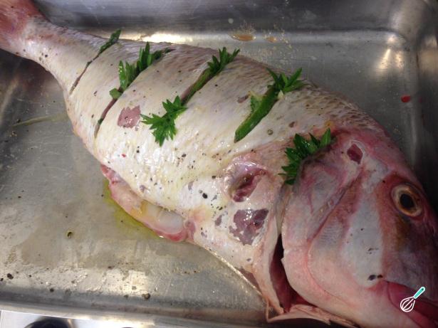 O primeiro passo é temperar o pargo para grelhar: faça nele 2-3 cortes de um lado e do outro, regue por dentro e por fora o suco dos limões e o azeite, e polvilhe a salsinha picada, sal e pimenta. Deixe tomar o gosto enquanto acende a churrasqueira.