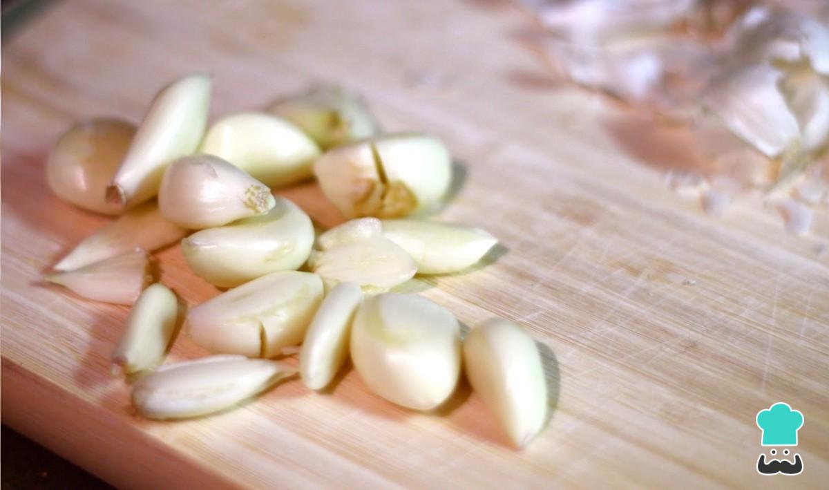 Para preparar esta pasta de alho para churrasco comece por separar os dentes de alho e descascar. Para acelerar essa tarefa, esmague-os com uma faca.