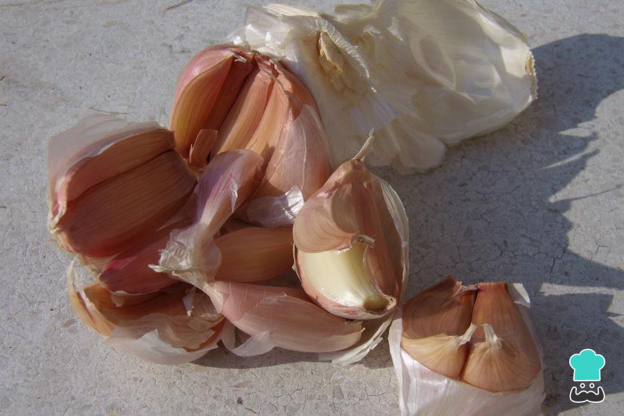 Para preparar esta pasta de alho para churrasco comece por separar e descascar os dentes de alho. Você conseguirá descascar os dentes de alho facilmente se os esmagar com uma faca.