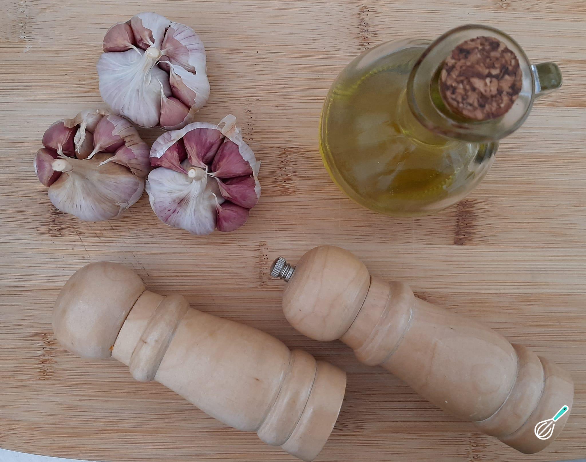 Separe todos os ingredientes necessários para preparar essa receita de pasta de alho para tempero.