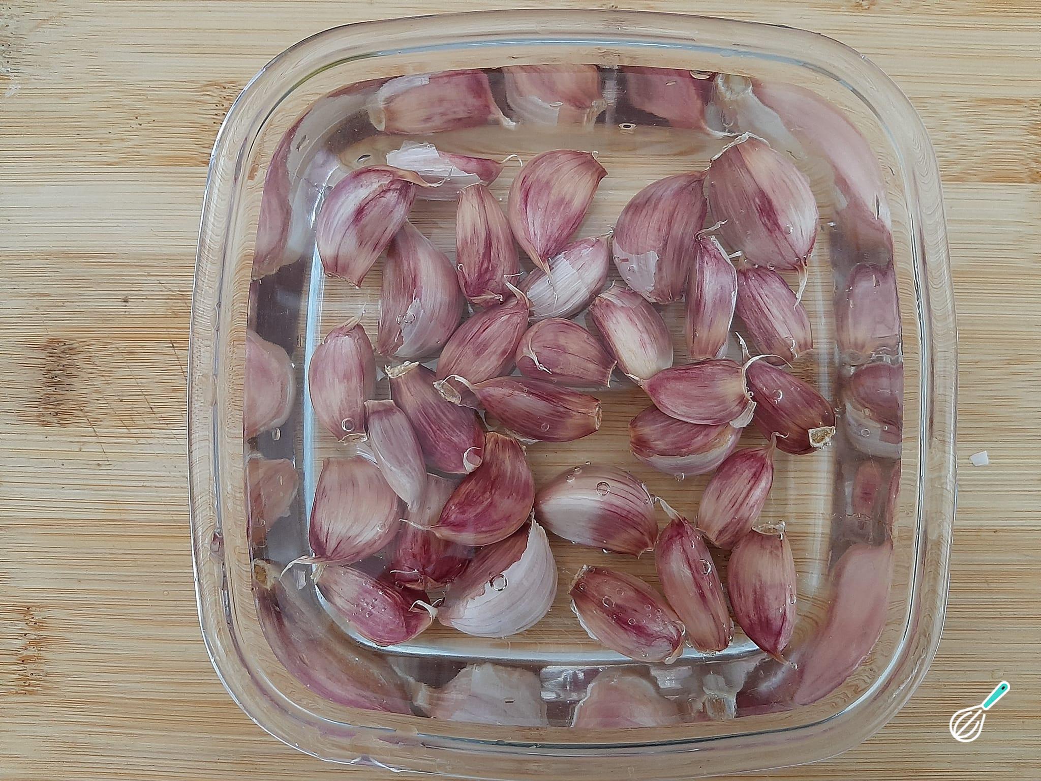 Se não estiver com pressa, use esta técnica: Deixe os dentes de alho submersos numa vasilha com água e espere 1 hora para descascá-los com mais facilidade.
