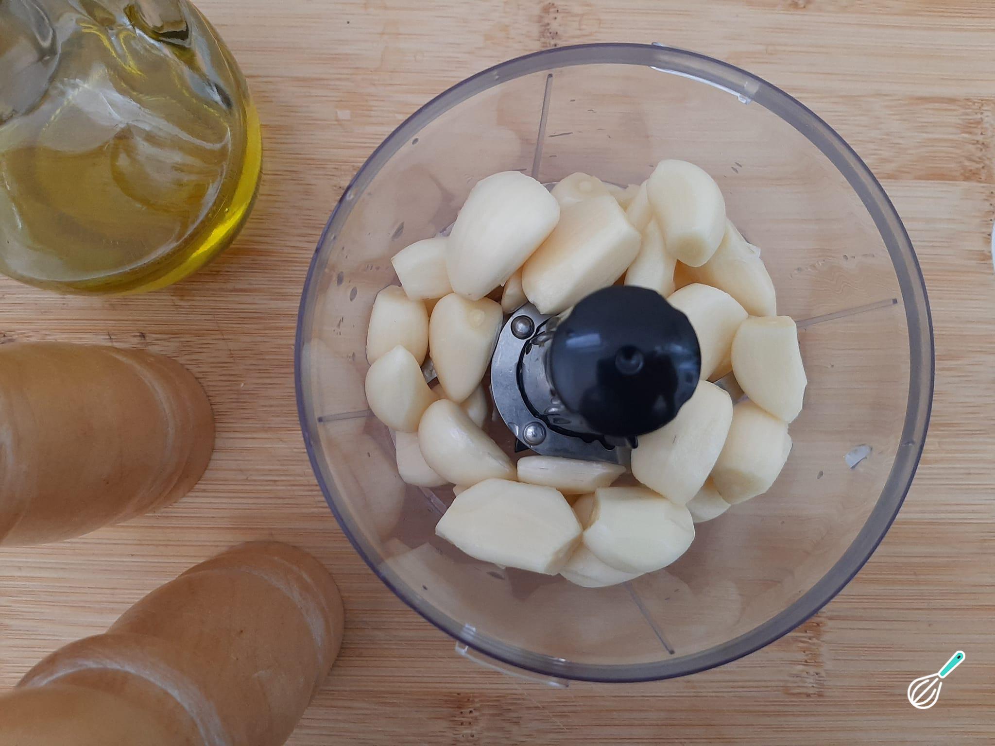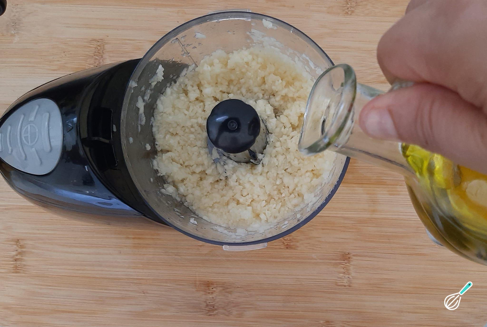 Dica: Se não tiver mini processador, utilize um liquidificador ou amasse os dentes de alho num pilão.