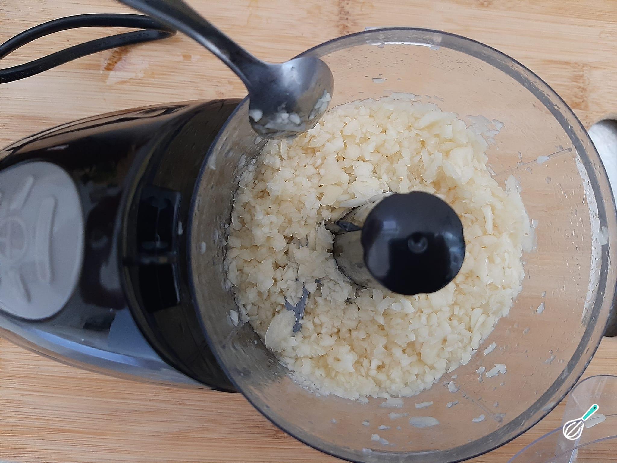 Depois de triturar bem os dentes de alho, junte tudo para o centro do mini processador com uma colher para deixar bem homogêneo.