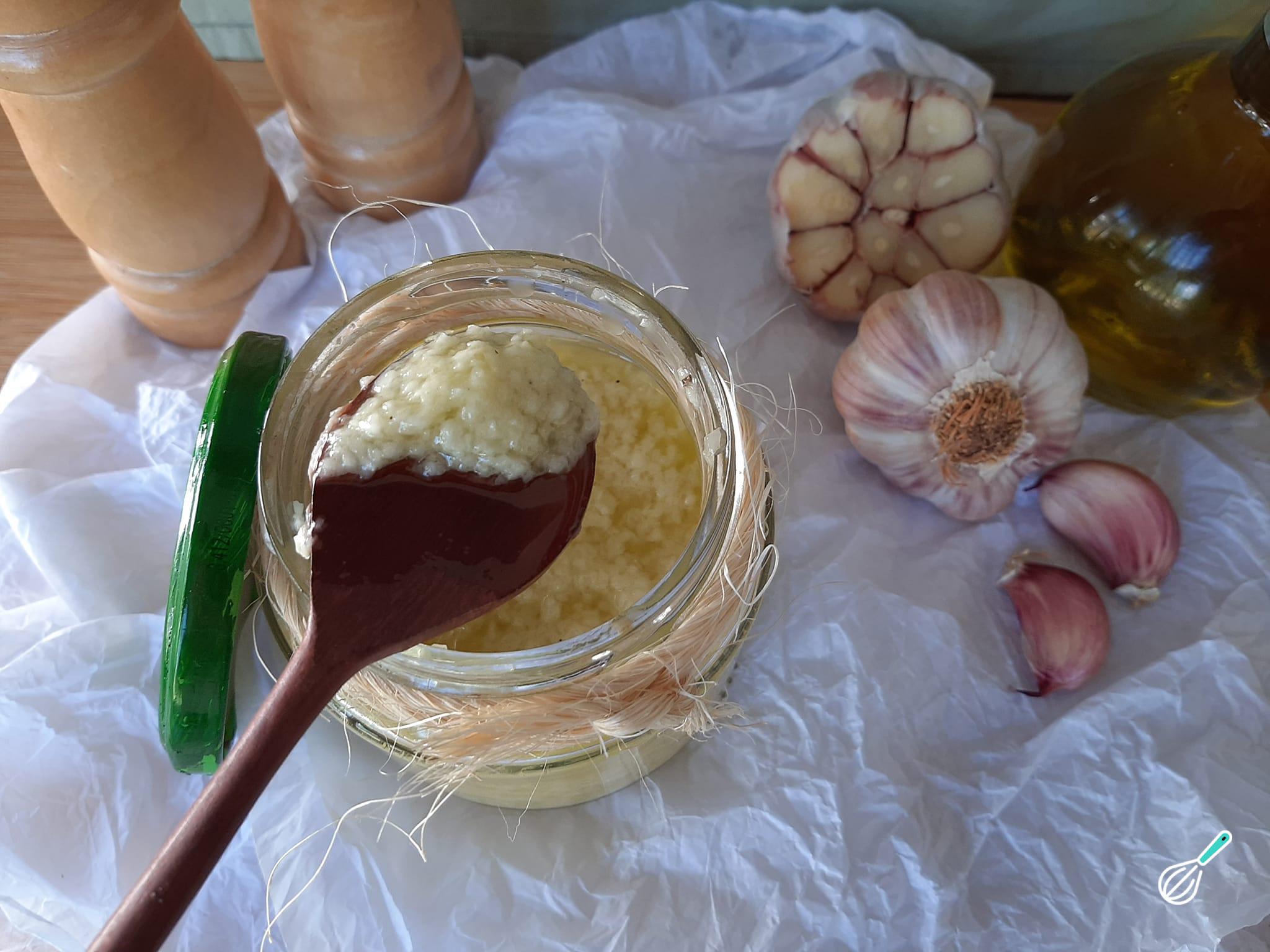 Com a pasta de alho para tempero pronto, acomode-a num pote de vidro esterilizado e guarde-a bem fechado, dentro da geladeira.