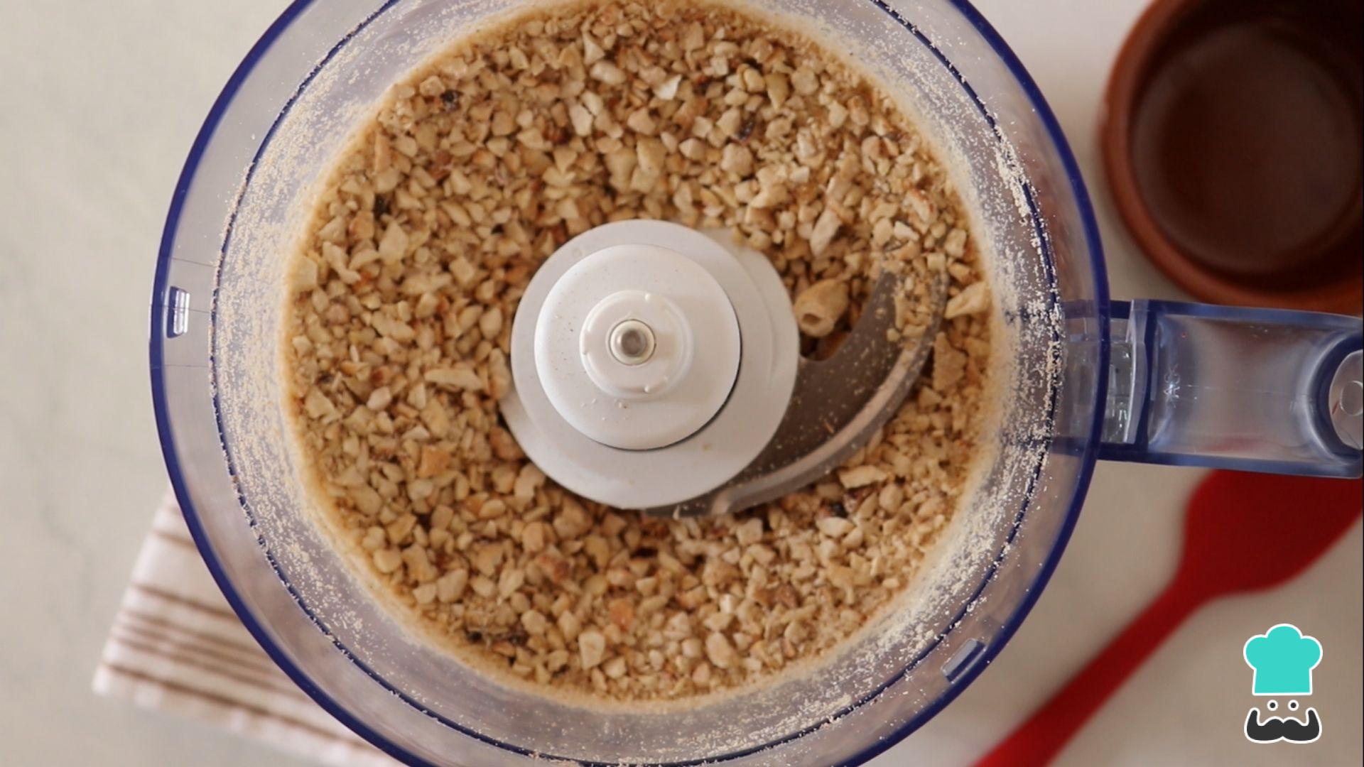 Após mais ou menos 5 minutos a castanha começa a ficar com uma textura parecida com areia molhada e começa a grudar nas laterais do processador. Use uma espátula pra empurrar de volta para o dentro do copo.