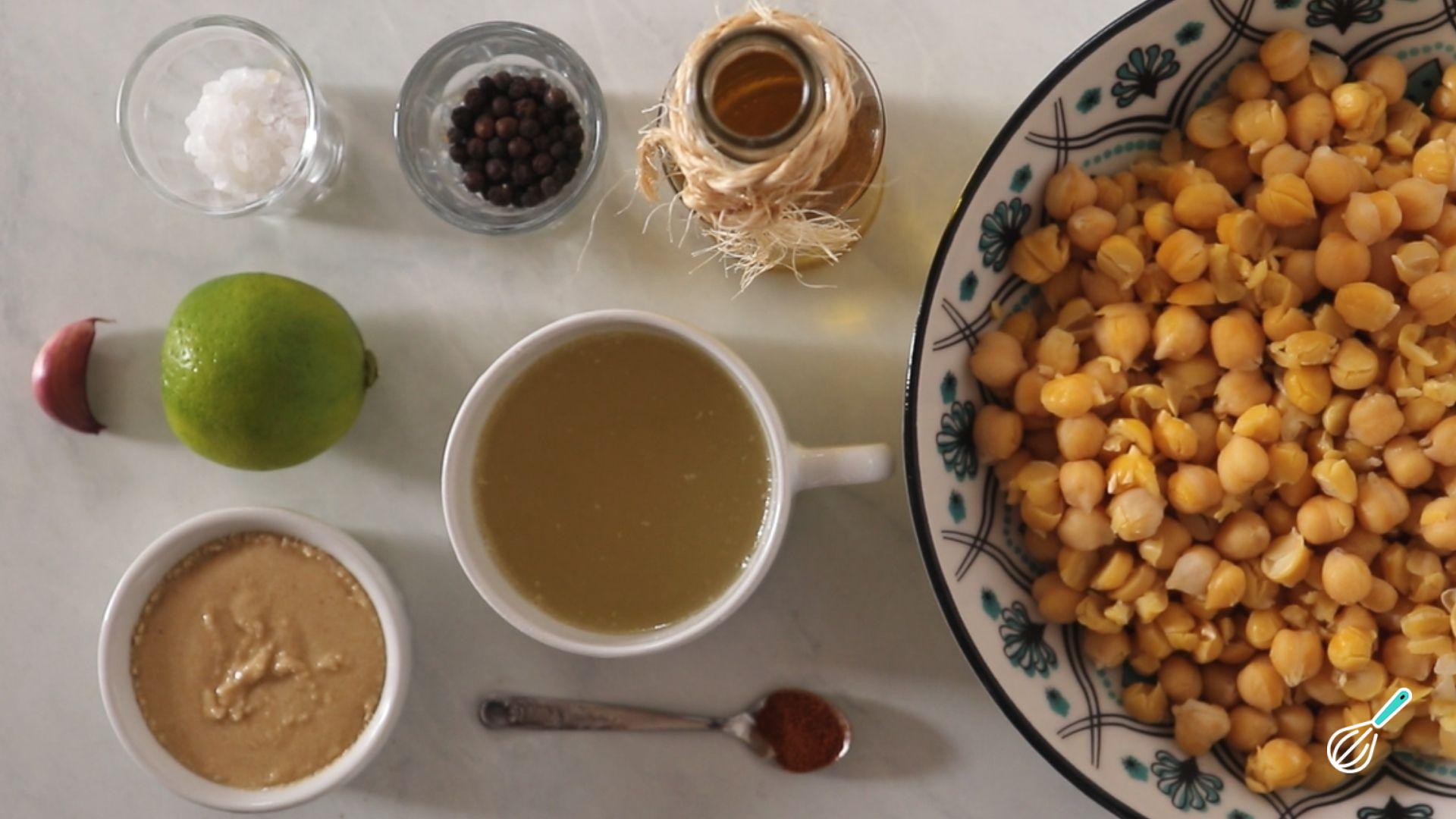 Comece separando todos os ingredientes da pasta de grão de bico árabe para facilitar o preparo.