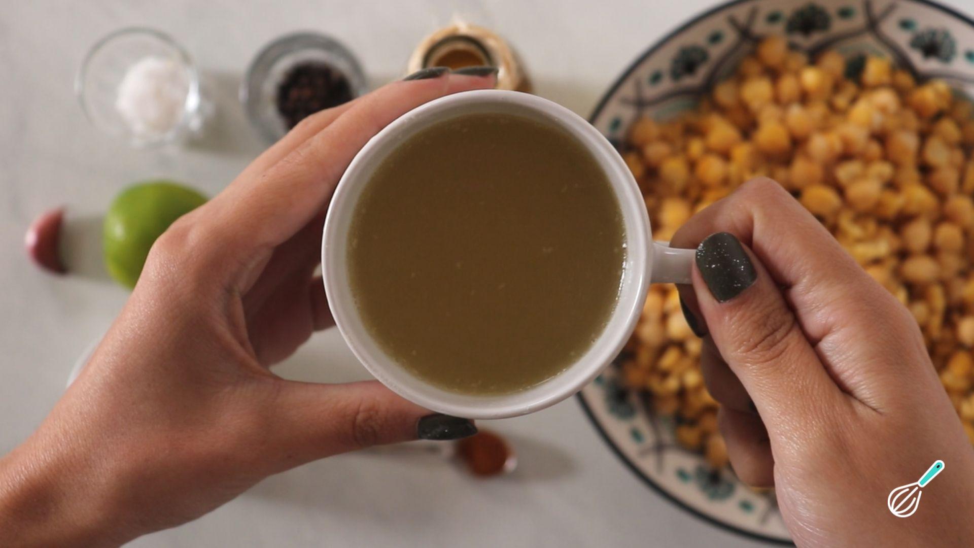 O grão de bico já deve estar cozido e você deve reservar pelo menos 1 xícara de chá do caldo do cozimento. Usaremos esse caldo no próximo passo.