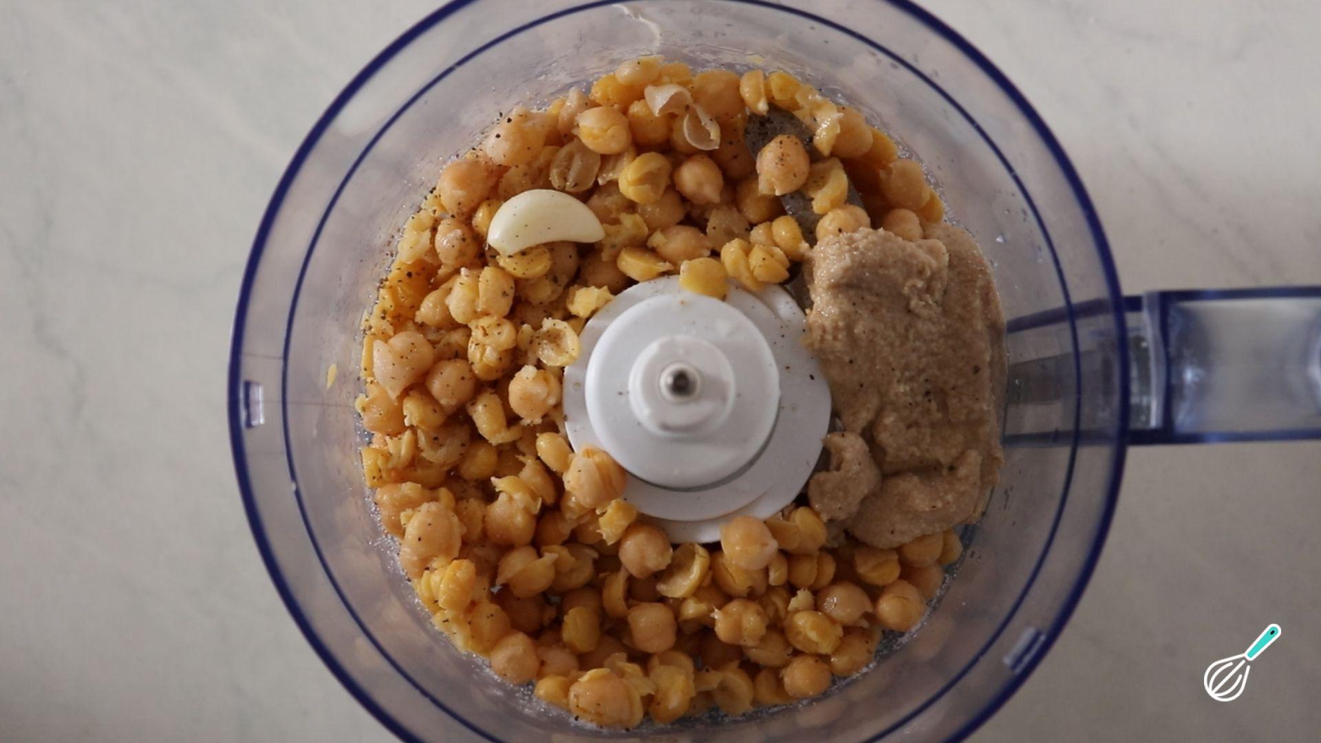 No processador de alimentos, coloque o grão-de-bico cozido, o alho, o suco de limão e o tahine. Tempere com sal e pimenta-do-reino a gosto e bata bem.