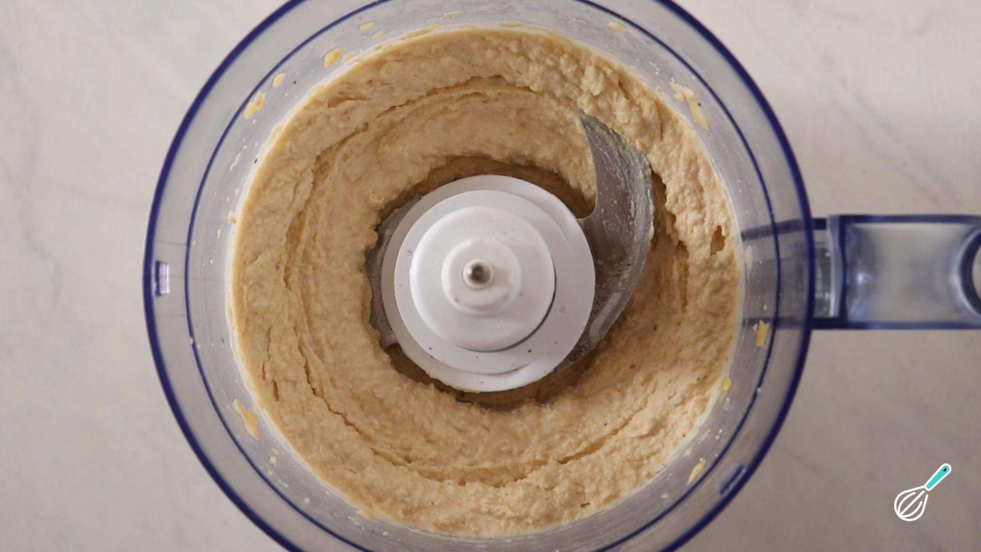 Adicione a água do cozimento do grão de bico aos poucos e bata novamente até obter uma pasta homogênea, como um patê mais grosso.