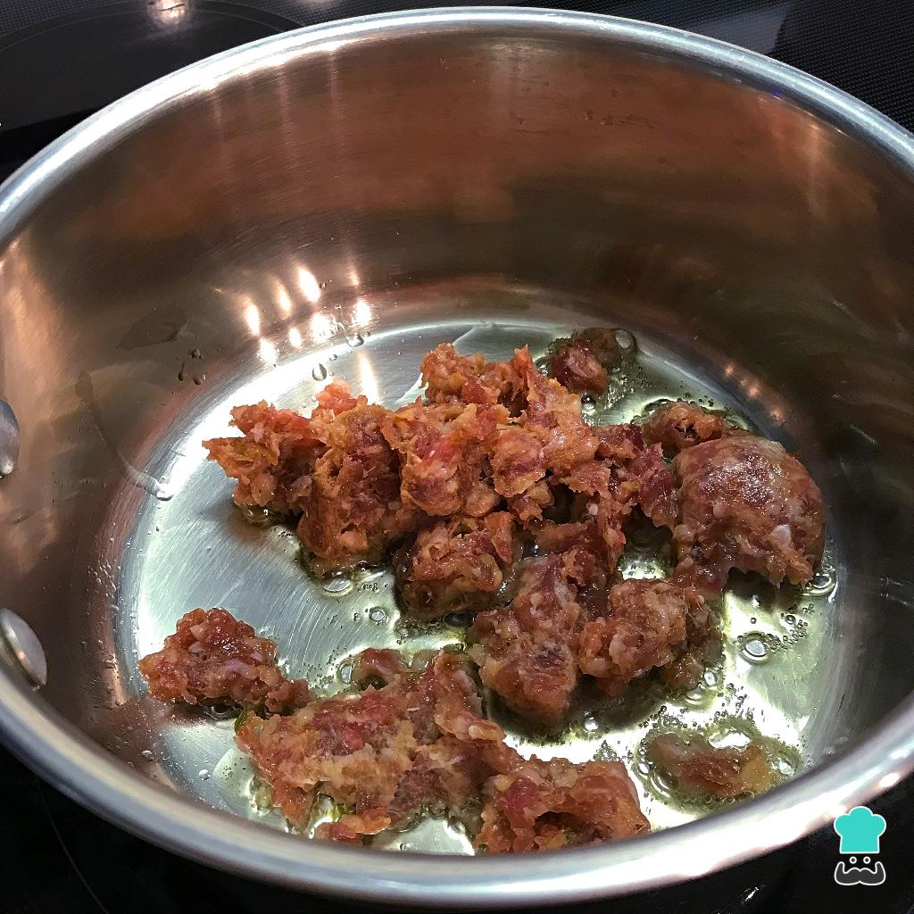 Comece aquecendo uma panela funda. Coloque a ghee e a linguiça para fritar até ficar dourada.