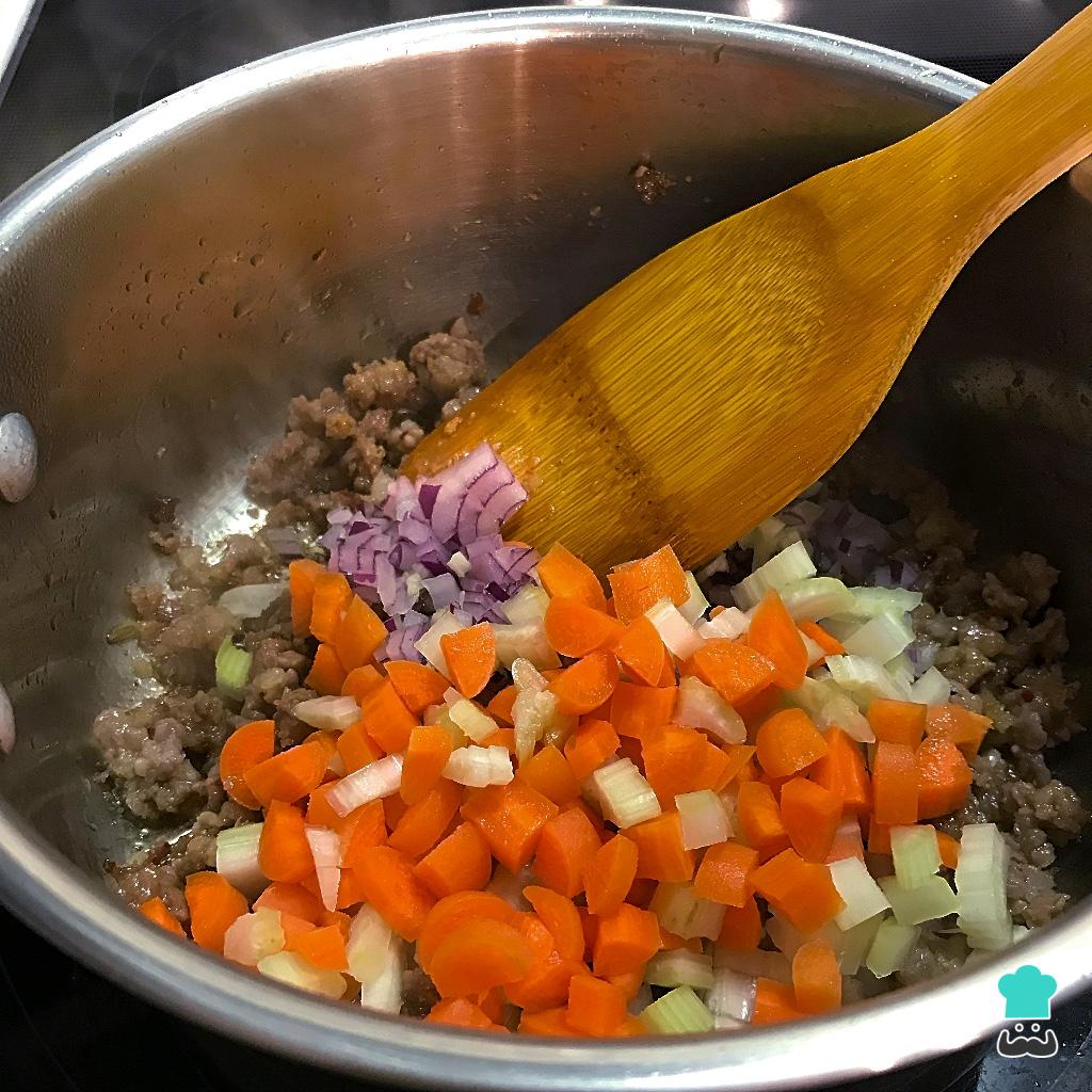 Adicione a cenoura, o salsão, a cebola e o alho picadinhos. Refogue por 2 minutos.