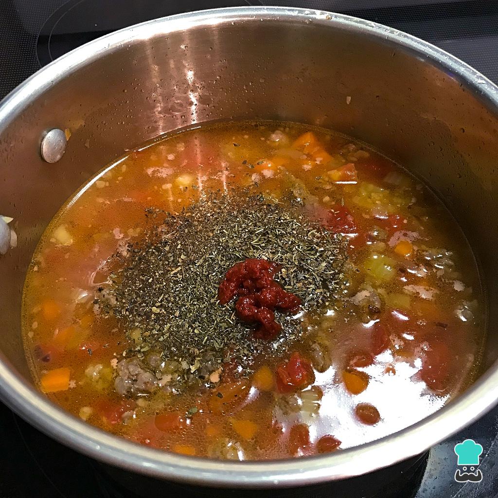 Adicione o caldo de frango, a água, o tomate pelado e os temperos (sal, pimenta, manjericão, tomilho e orégano). Cozinhe em fogo baixo por uns 15 minutos, até os legumes ficarem cozidos.