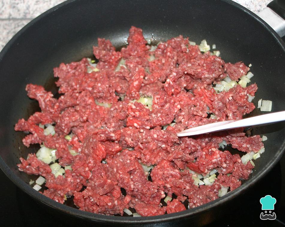 Para preparar o "pastel" de milho chileno comece por cozinhar a carne moída. Para isso pique as cebolas e os alhos e coloque numa panela ou frigideira funda com um fio de óleo. Leve ao fogo médio-baixo e deixe refogar por 1-2 minutos ou até a cebola ficar macia, mexendo de vez em quando.