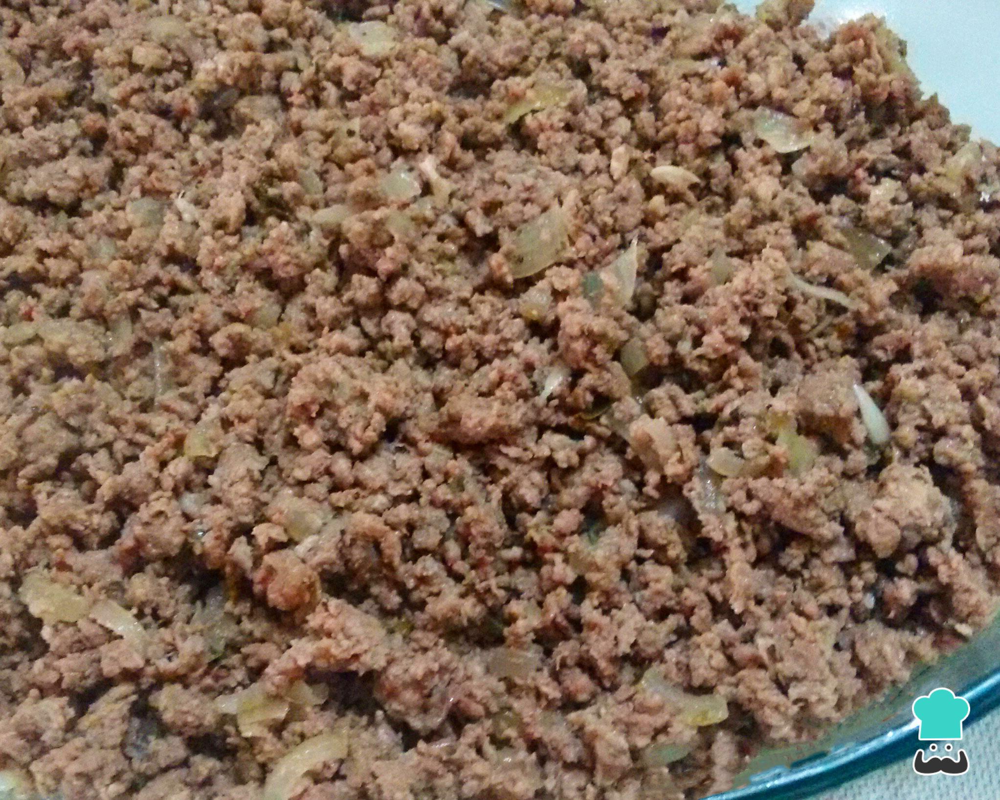 Para montar a torta de milho chilena você pode usar assadeiras individuais ou uma única assadeira grande. No fundo da(s) assadeira(s) espalhe a carne moída refogada e adicione algumas uvas-passa ou azeitonas sem caroço e os ovos cozidos descascados e picados. Se quiser, acrescente também as coxas de frango.