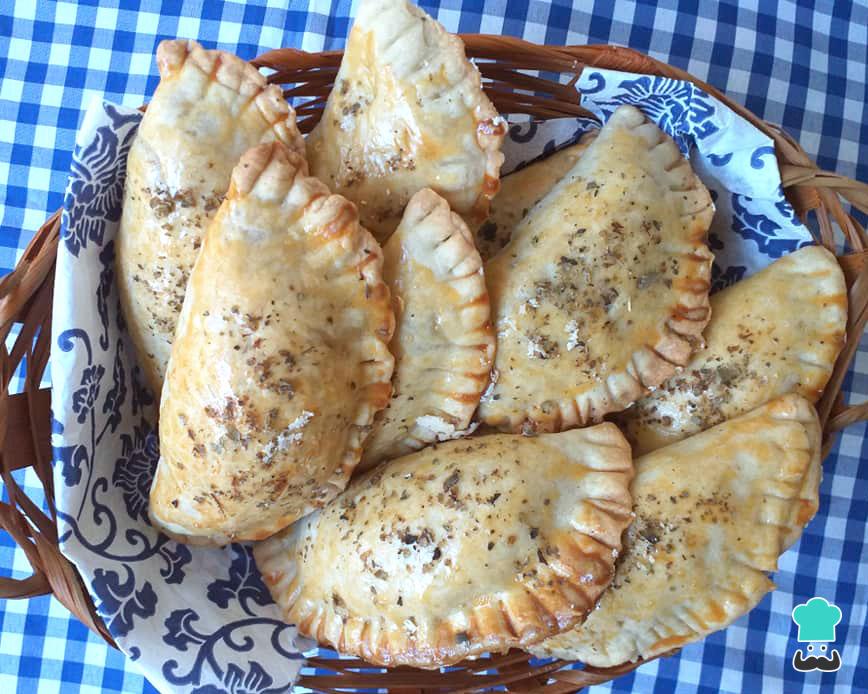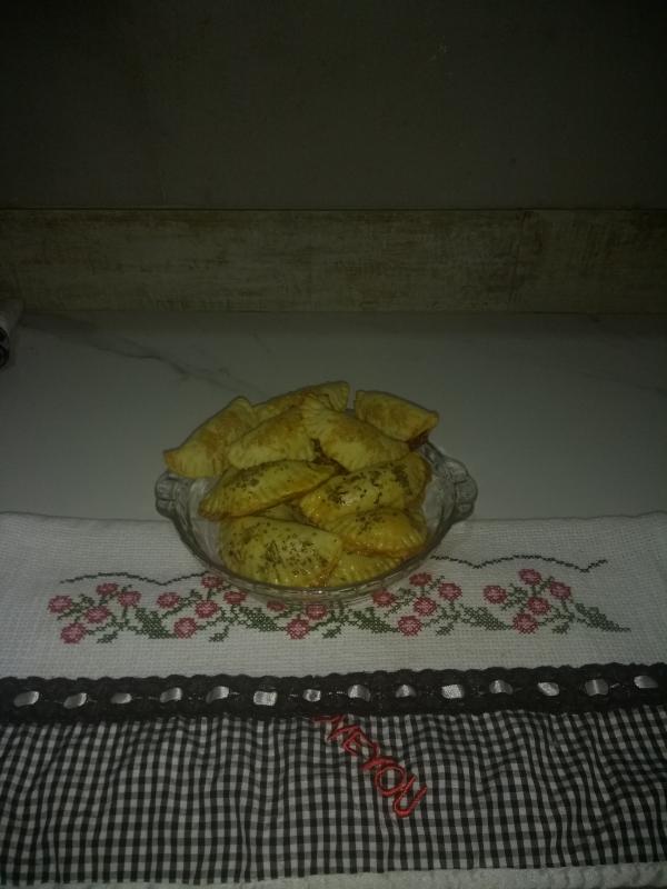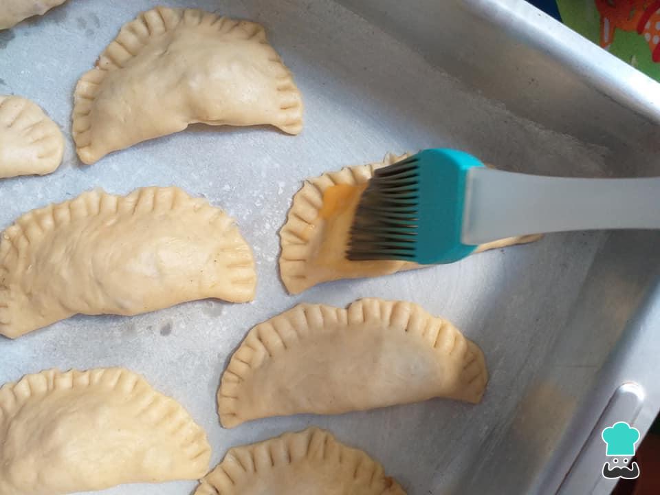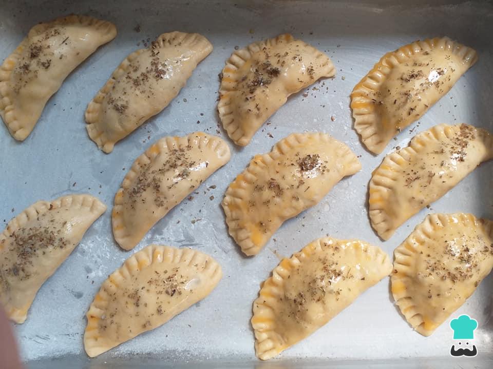 Acomode-os numa assadeira grande, untada e enfarinhada. Pincele com gema de ovo e polvilhe orégano sobre os pastéis.