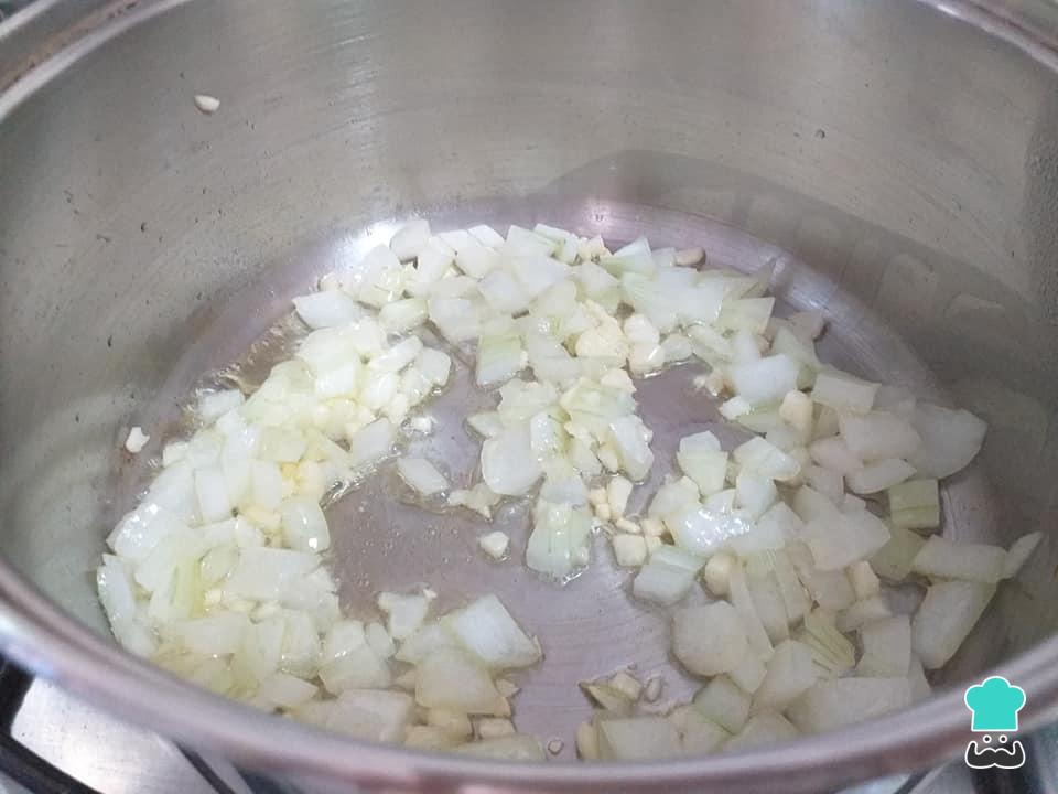 Primeiro prepare o recheio. Numa panela, aqueça o azeite de oliva e acrescente a cebola e o alho, picados.