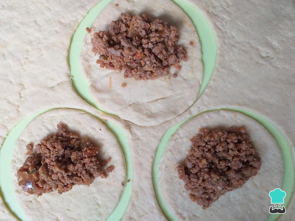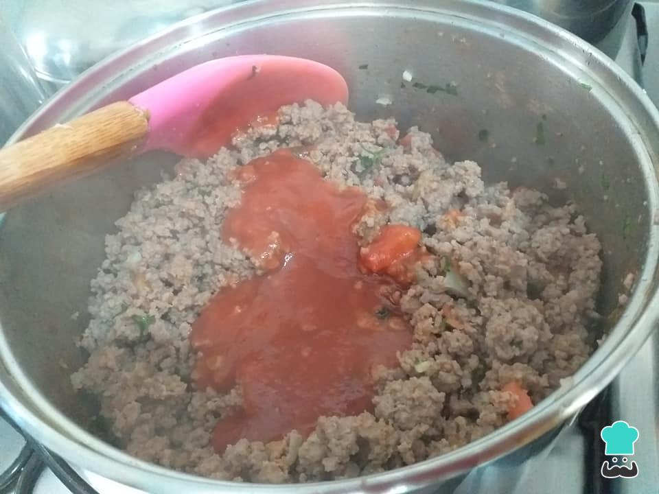 Dica: Se quiser, poderá incluir ovo cozido picado sobre o recheio de carne moída neste momento.