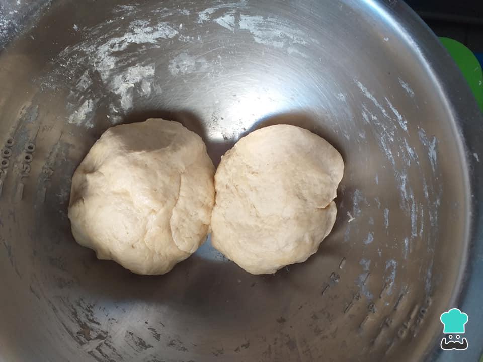Quando a massa estiver desgrudando das mãos, estará pronta para ser trabalhada. Divida a massa em duas partes.