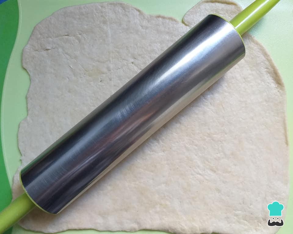 Numa superfície lisa, polvilhe farinha de trigo e abra a massa com a ajuda de um rolo de macarrão. A massa não poderá ficar muito fina, para que não se quebre com facilidade.