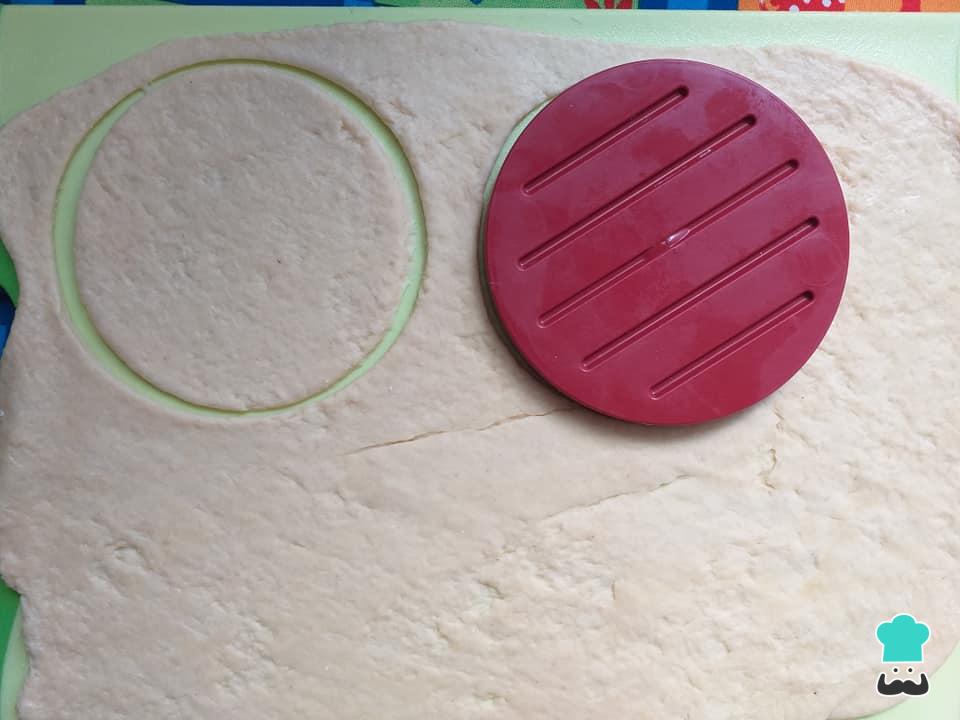 Corte a massa em círculos, com a ajuda de um cortador ou qualquer objeto redondo.