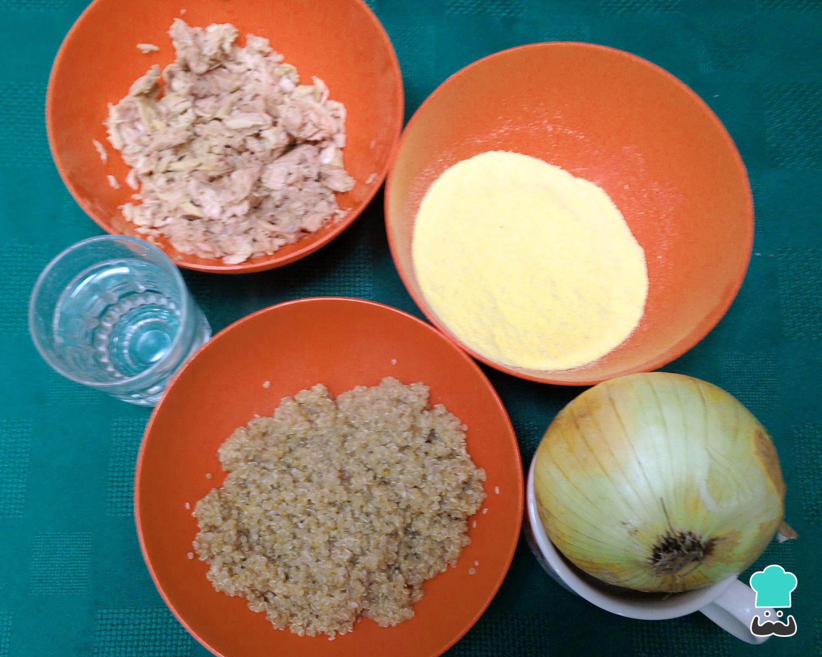 Reúna os ingredientes necessários ao preparo desta receita de pastel caipira com farinha de milho. Neste caso, no recheio usei cebola, atum e quinoa, mas você pode rechear com outras opções que indicamos abaixo.