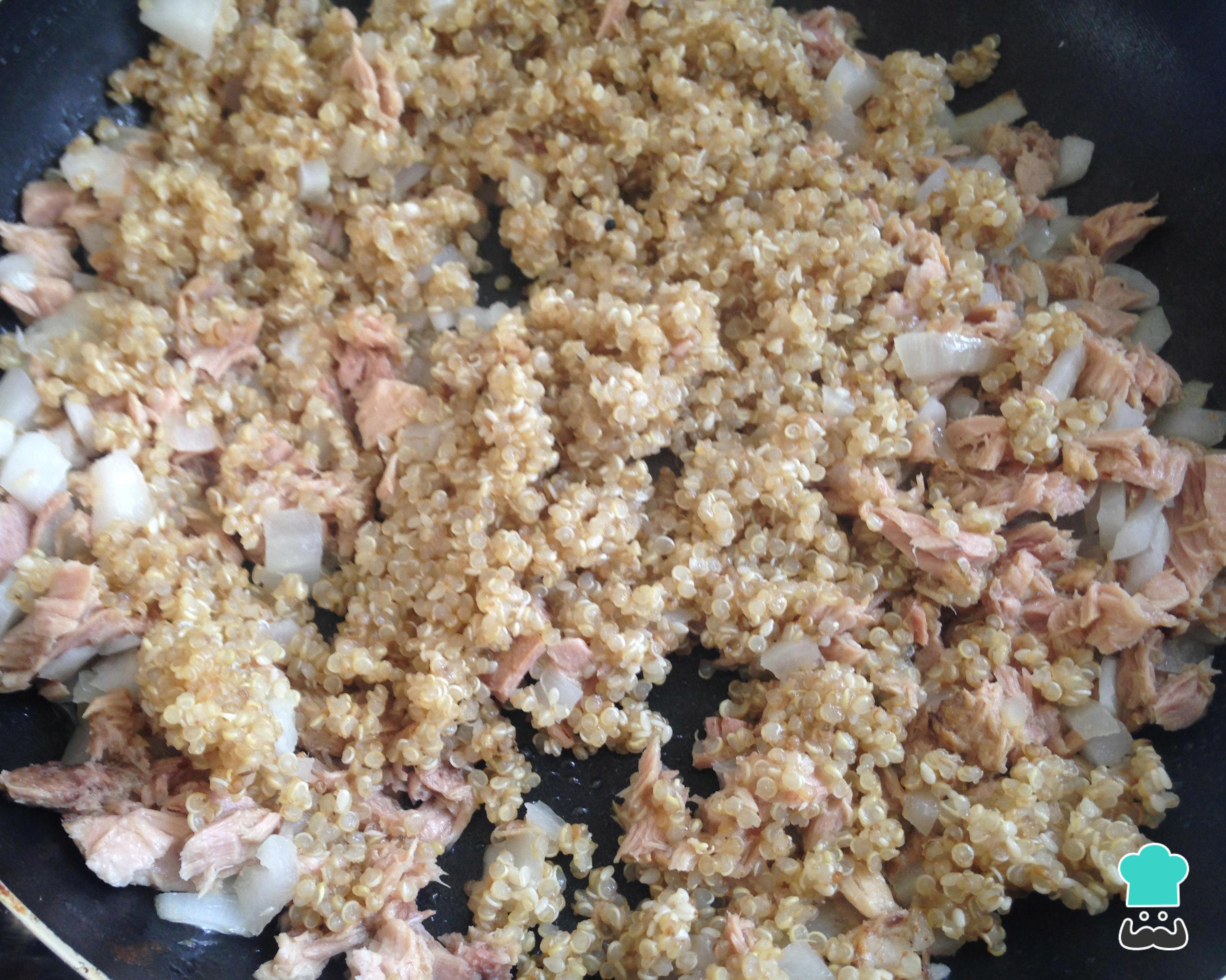 Prepare o recheio dos pastéis. Neste caso refoguei a cebola picada em um pouco de azeite, depois acrescentei o atum escorrido e a quinoa cozida. Temperei com sal e pimenta.