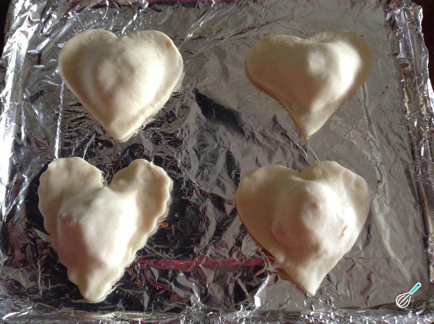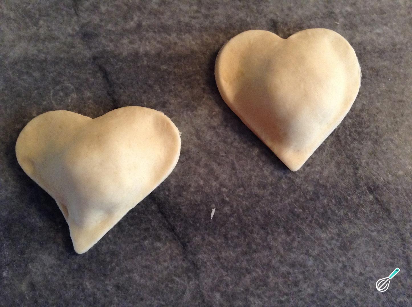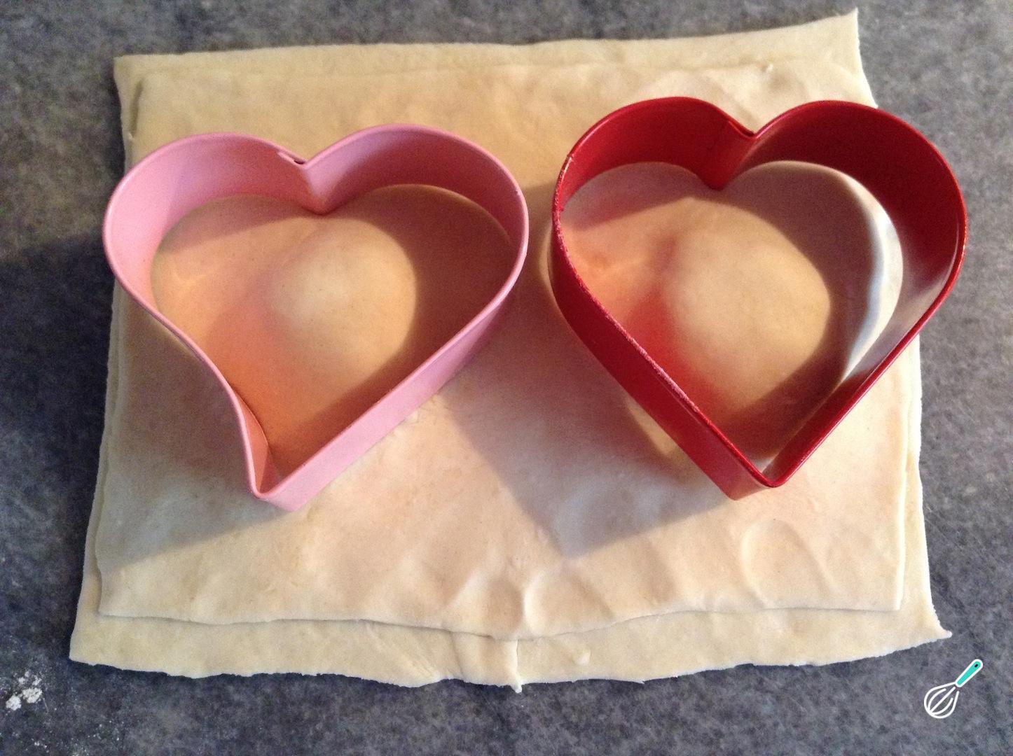 Abra a massa folhada e estique com a ajuda de um rolo, até obter uma massa fina. Com a ajuda de uma colher de sobremesa, coloque porções de recheio sobre metade da massa, deixando espaço suficiente entre eles para cortar os pastéis em forma de coração.