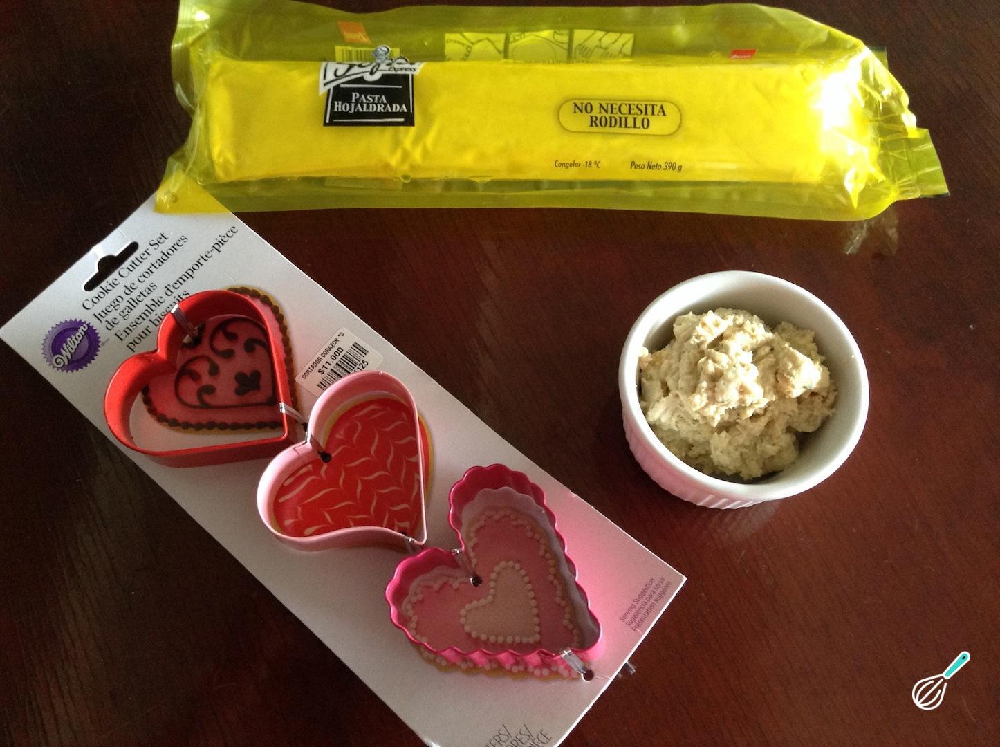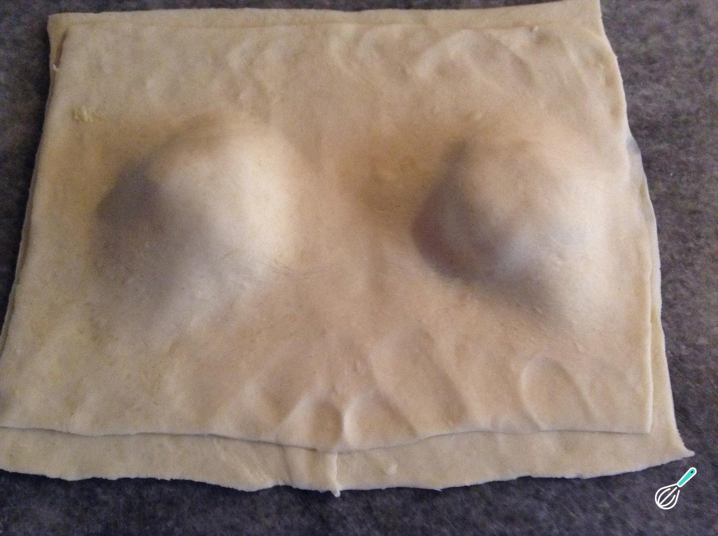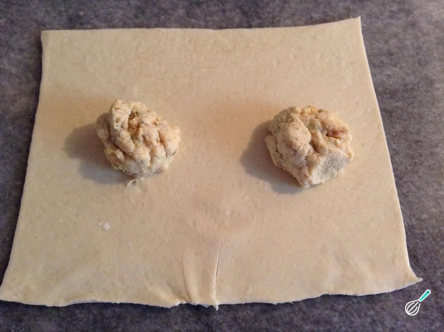 Abra a massa folhada e estique com a ajuda de um rolo, até obter uma massa fina. Com a ajuda de uma colher de sobremesa, coloque porções de recheio sobre metade da massa, deixando espaço suficiente entre eles para cortar os pastéis em forma de coração.