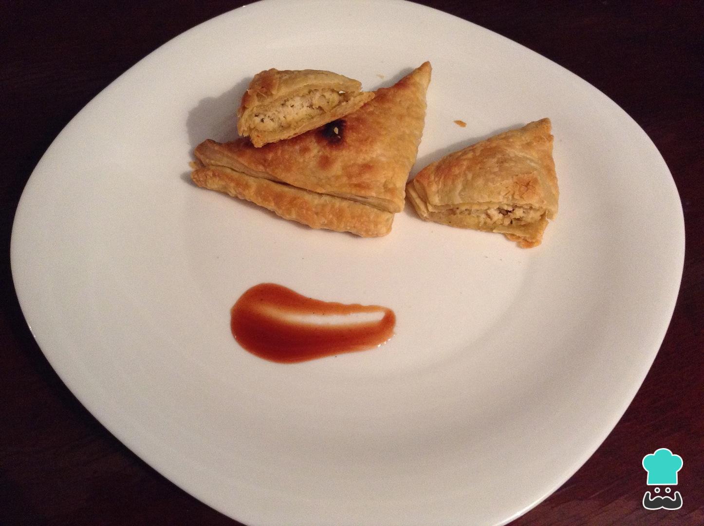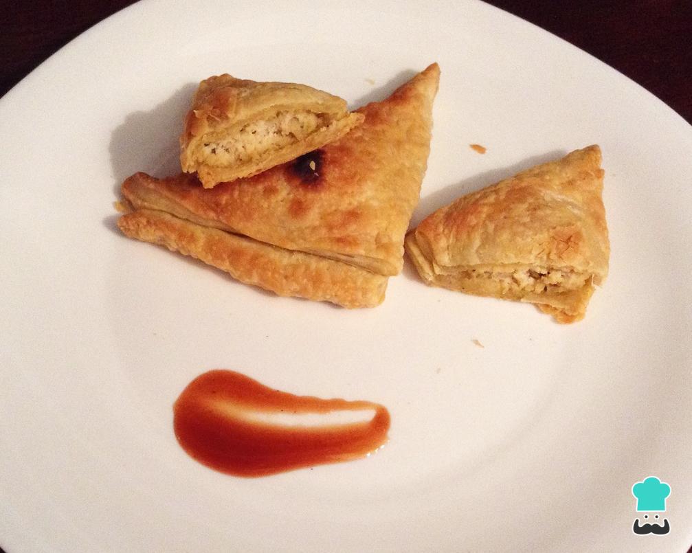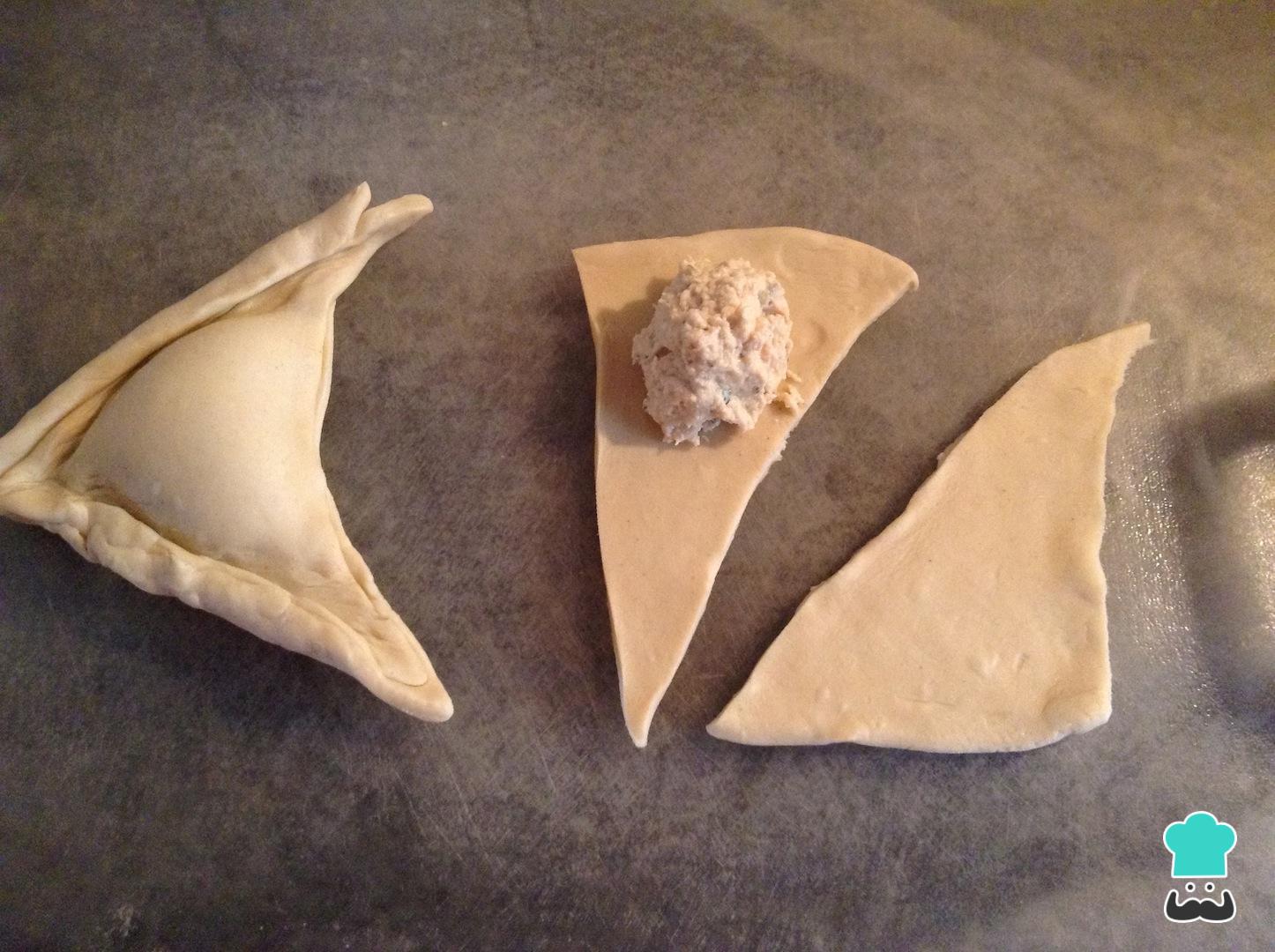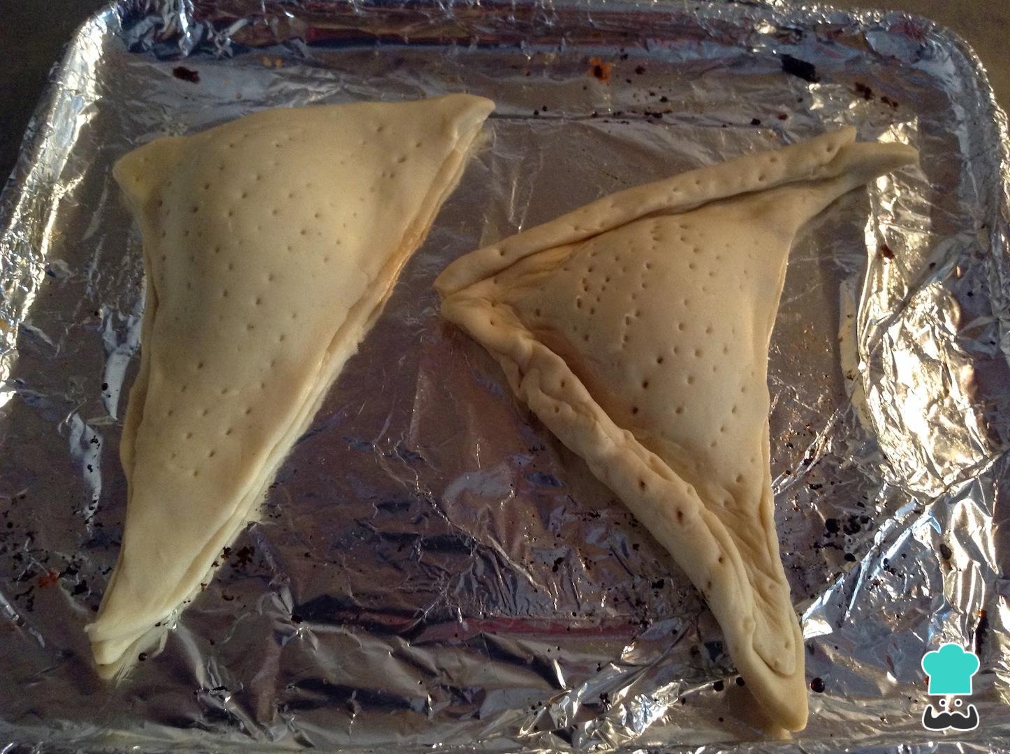Coloque uma porção do preparado anterior em metade dos triângulos de massa folhada, e feche com uma das outras metades. Feche bem as beiradas, dobrando-as ou colando com um pouco de água ou ovo batido.