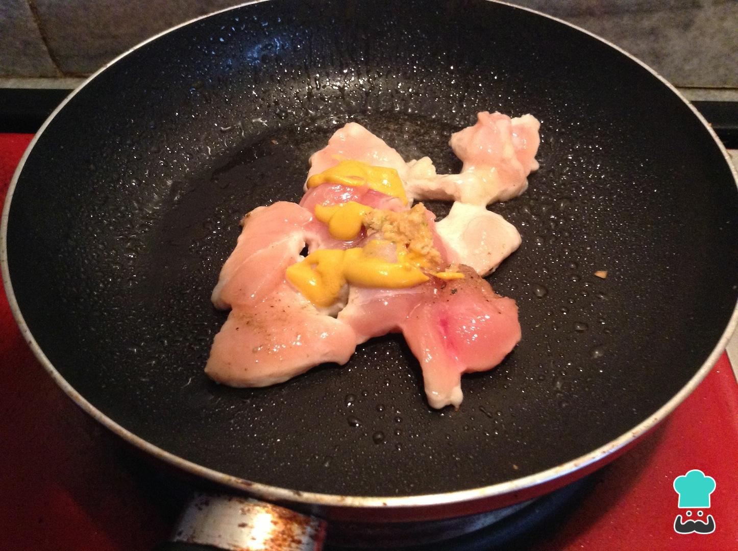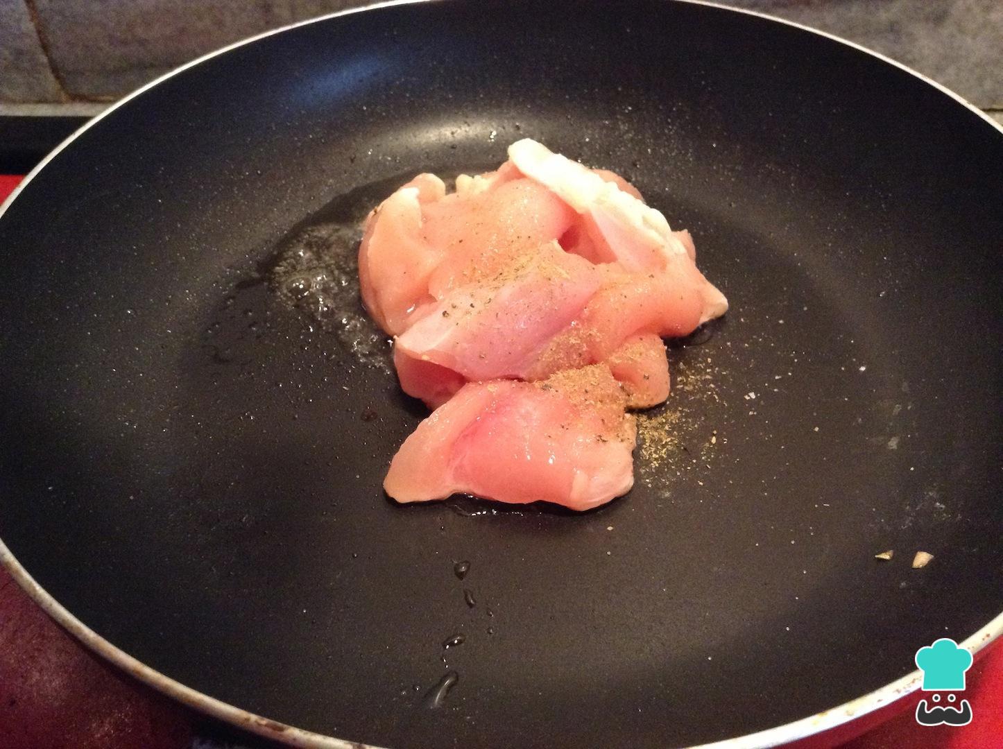 Numa frigideira em fogo médio com o óleo de girassol, cozinhe o peito de frango cortado em cubos médios e temperado com sal e pimenta a gosto.