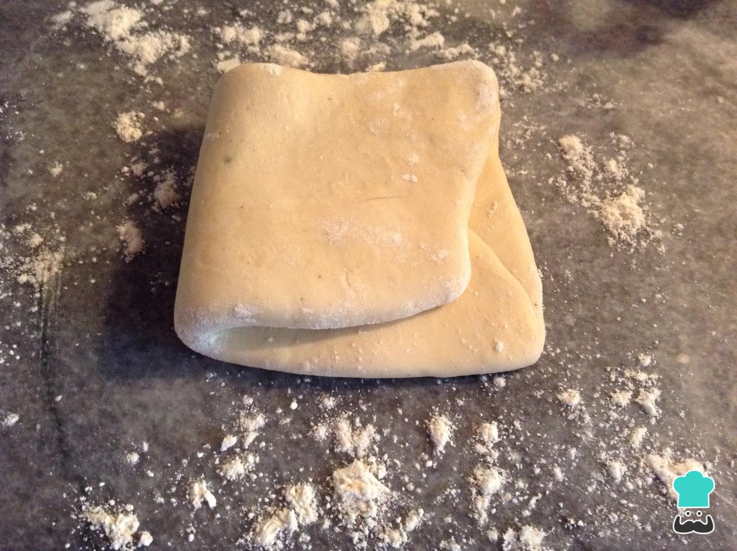 Enquanto o recheio de frango esfria, o passo seguinte desta receita de pastel colombiano é preparar a massa. Você pode usar massa folhada caseira ou industrial, comece por a esticar com a ajuda de um rolo.