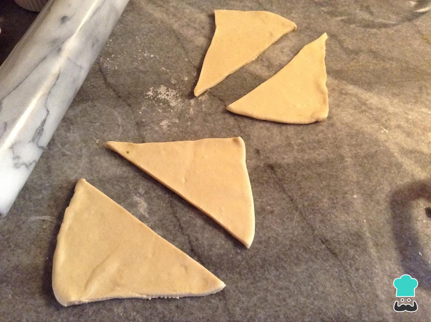 Corte triângulos de massa, tal como na fotografia abaixo. É importante que o número de triângulos seja par, para que possa fazer os pastéis.