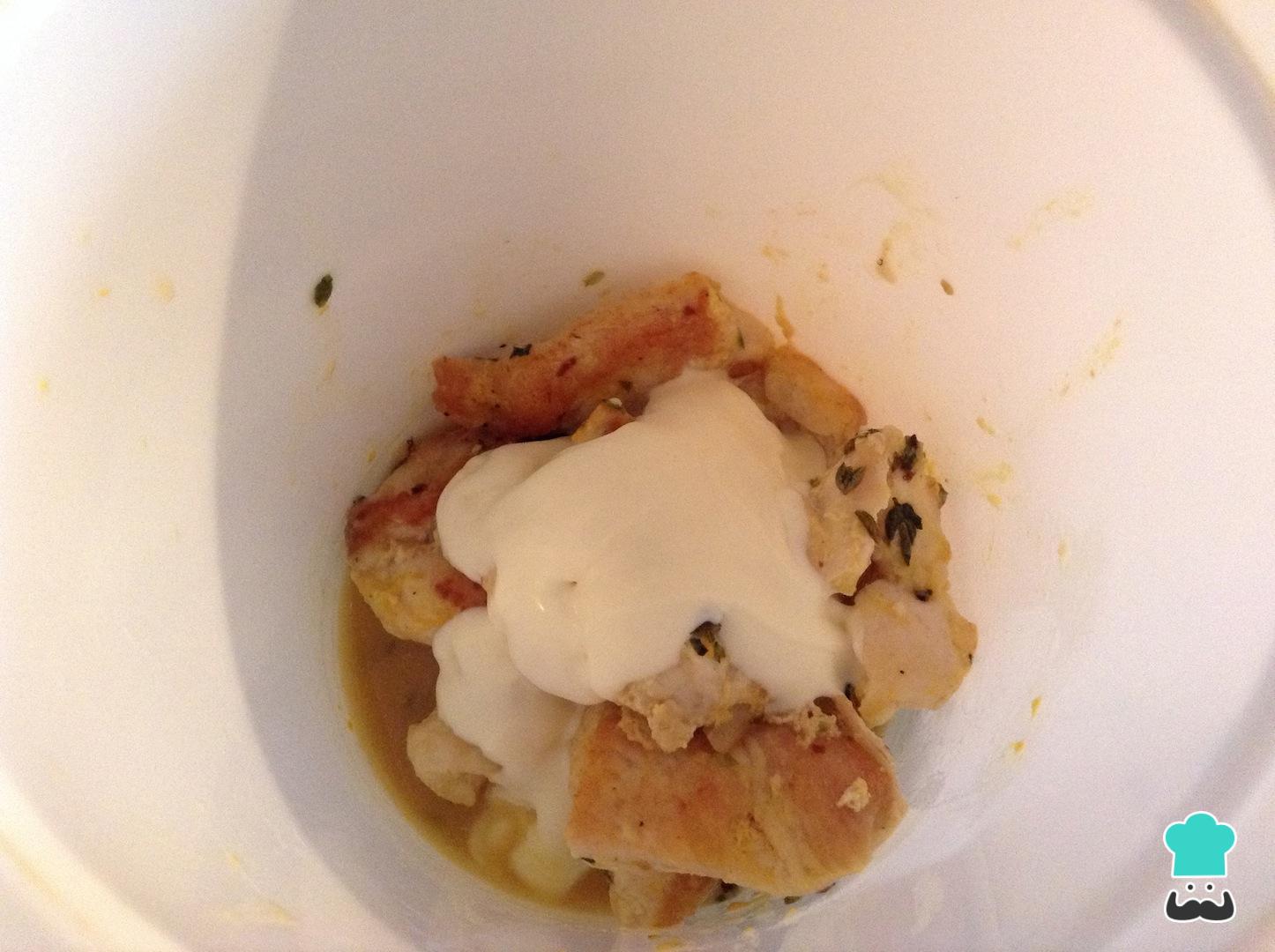 Termine de preparar o recheio destes pastéis de massa folhada, batendo no liquidificador ou com o mixer o frango junto com o creme de leite.