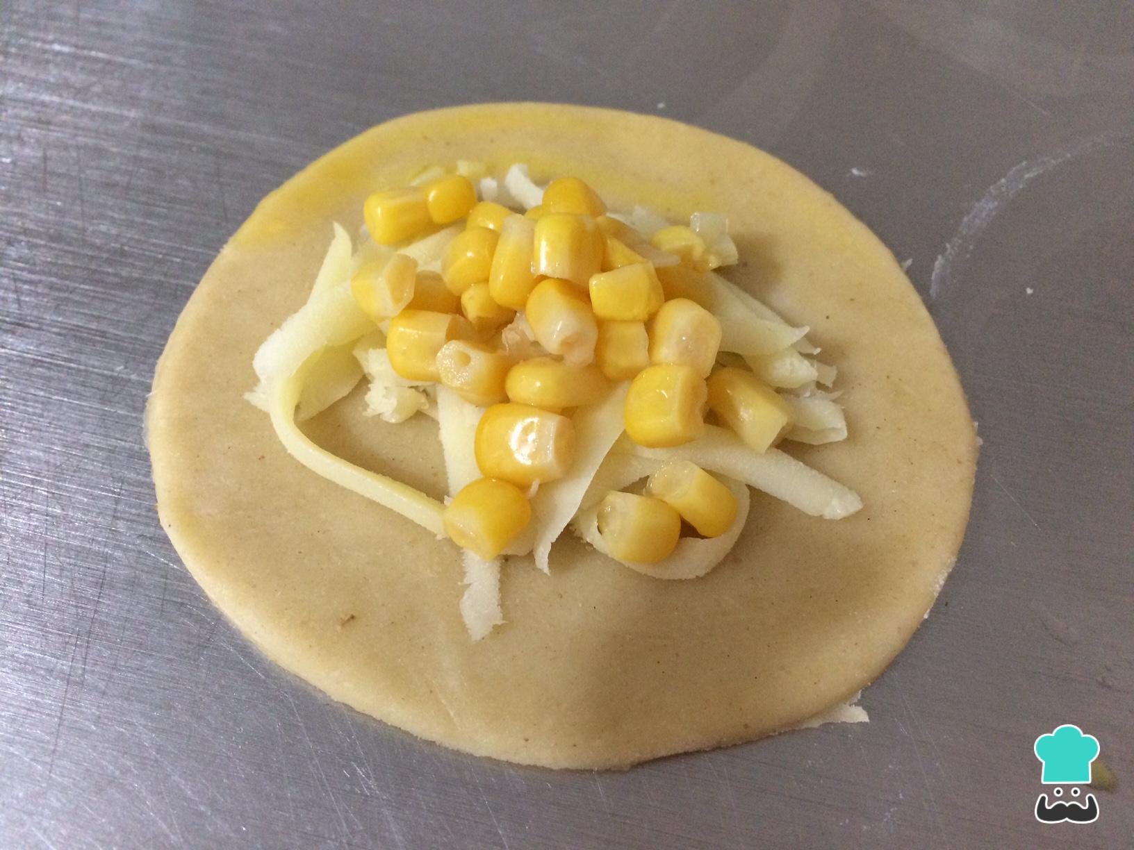 Em cada disco de massa coloque uma porção de queijo ralado, milho e requeijão. Ajuste a quantidade de recheio em função do tamanho do disco de massa, para ela não abrir no forno. Ligue o forno nos 180ºC.
