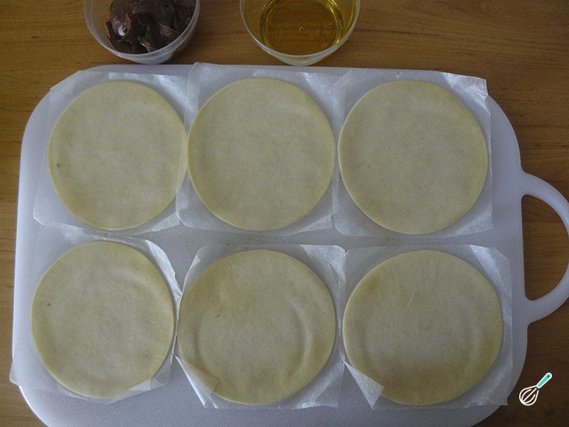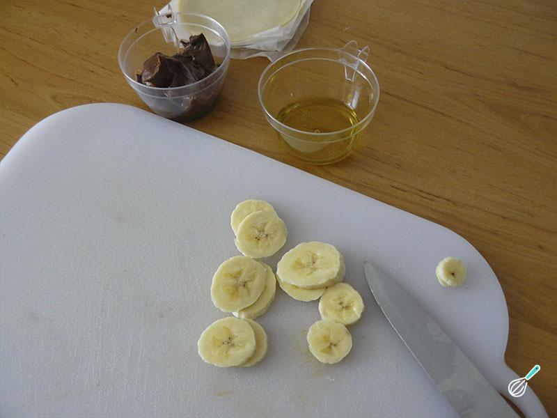 No centro de cada folha de massa, coloque uma colher de Nutella. Coloque também duas rodelas de banana sobre o creme de chocolate.