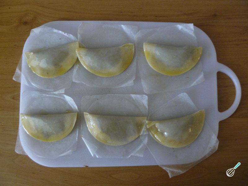 Feche bem os pastéis para evitar que o recheio não saia durante a fritura e unte a sua superfície com um pouco de óleo.