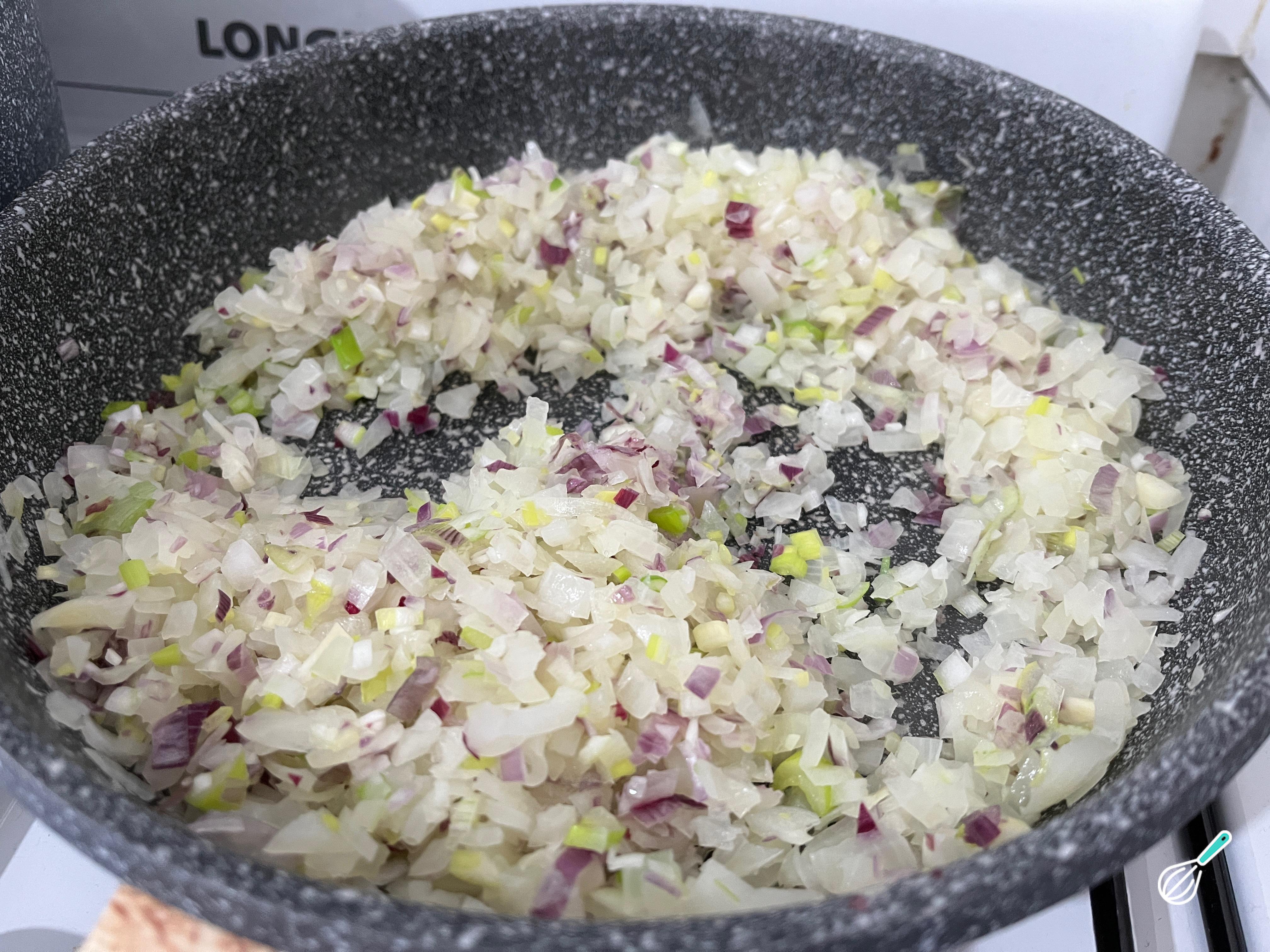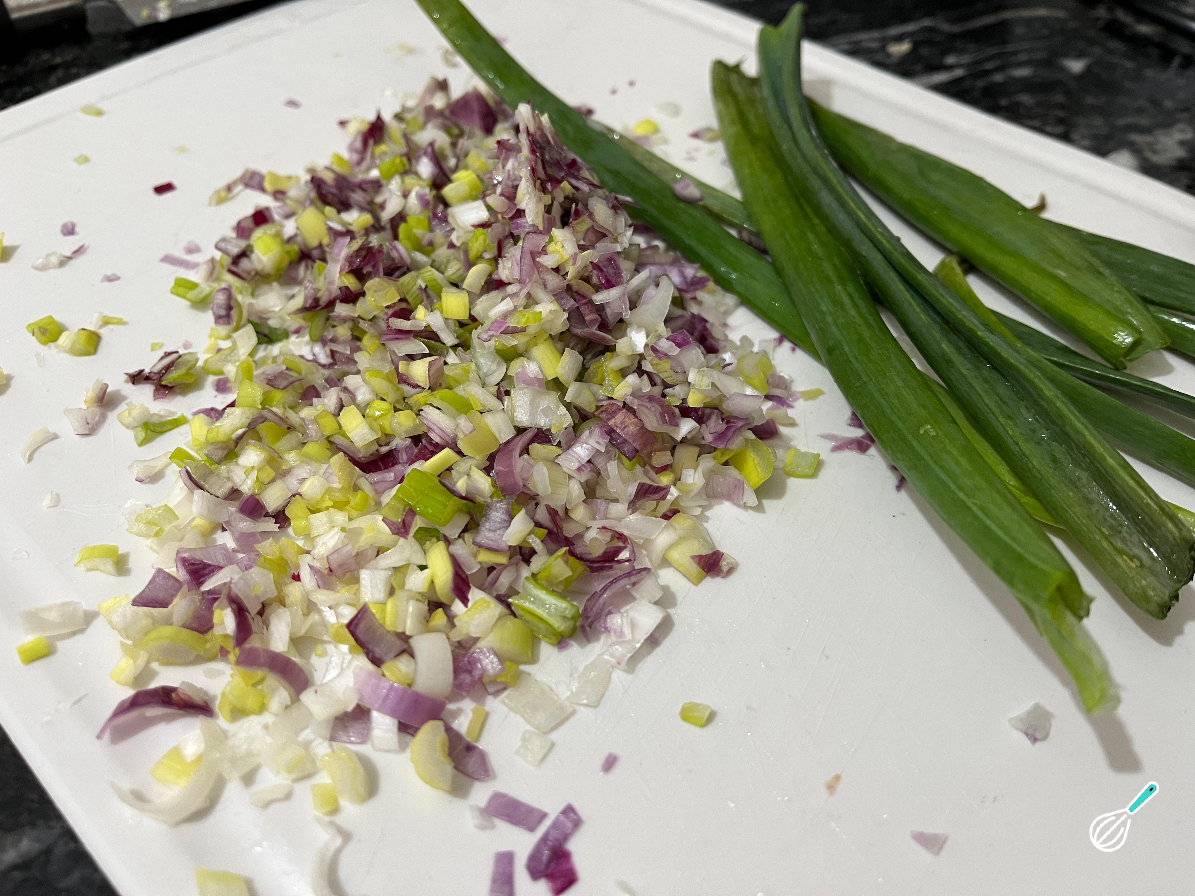Enquanto isso, descasque e pique a cebola junto com a parte branca da cebolinha.