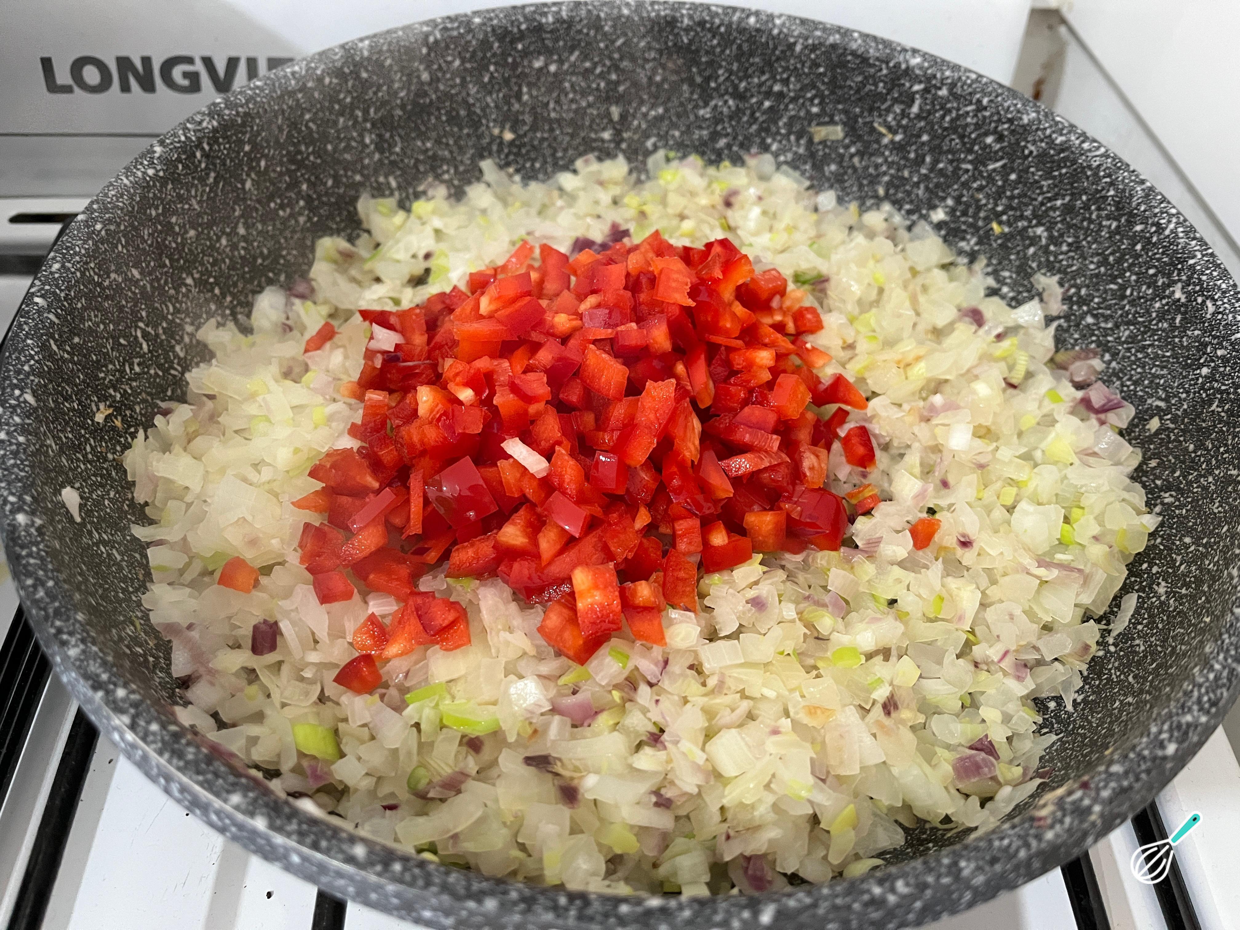Adicione o pimentão limpo e picado, sem a parte branca ou sementes. Refogue até que os legumes estejam bem cozidos. Se o refogado estiver secando, adicione algumas colheres de sopa de água quente.