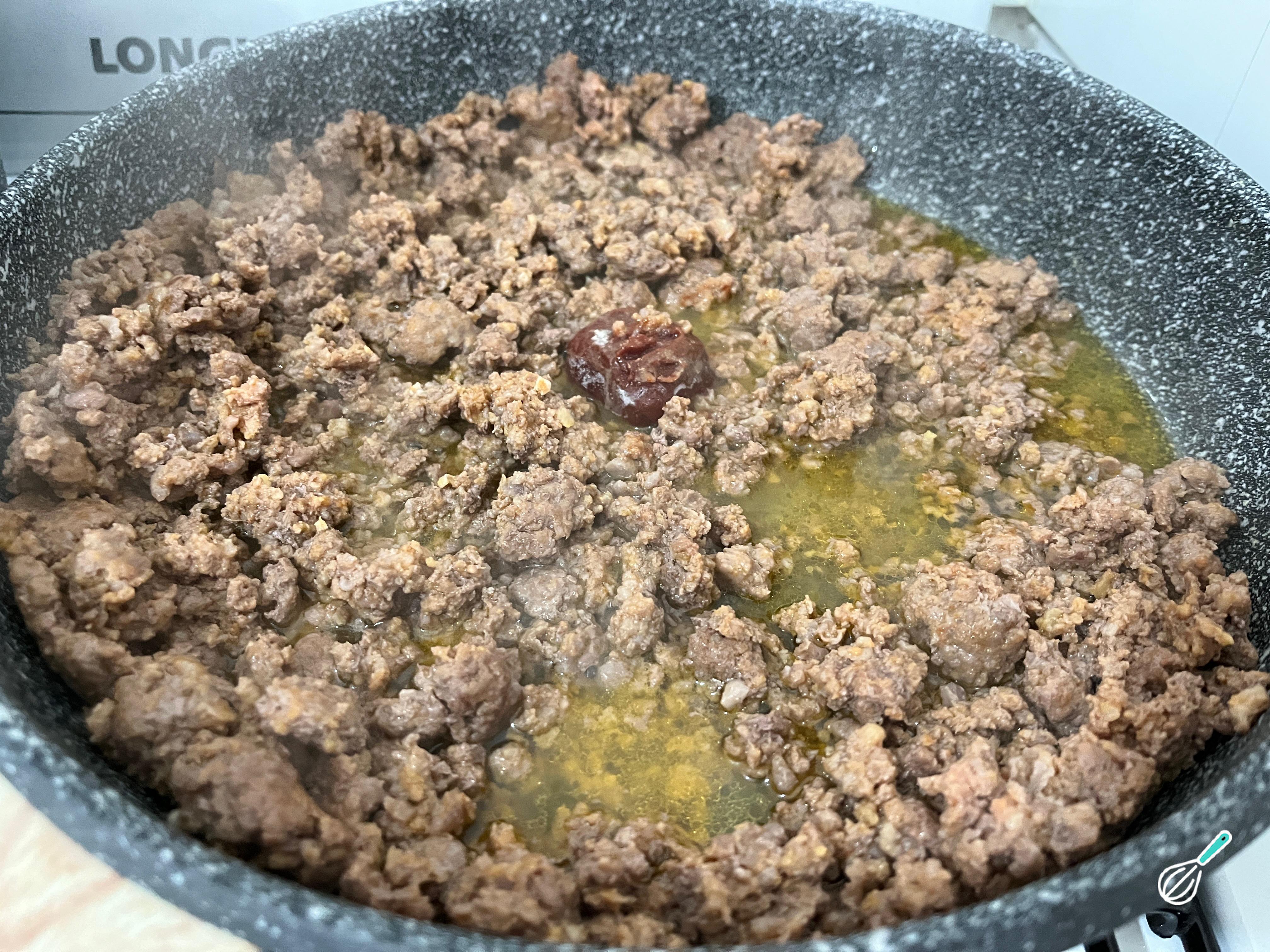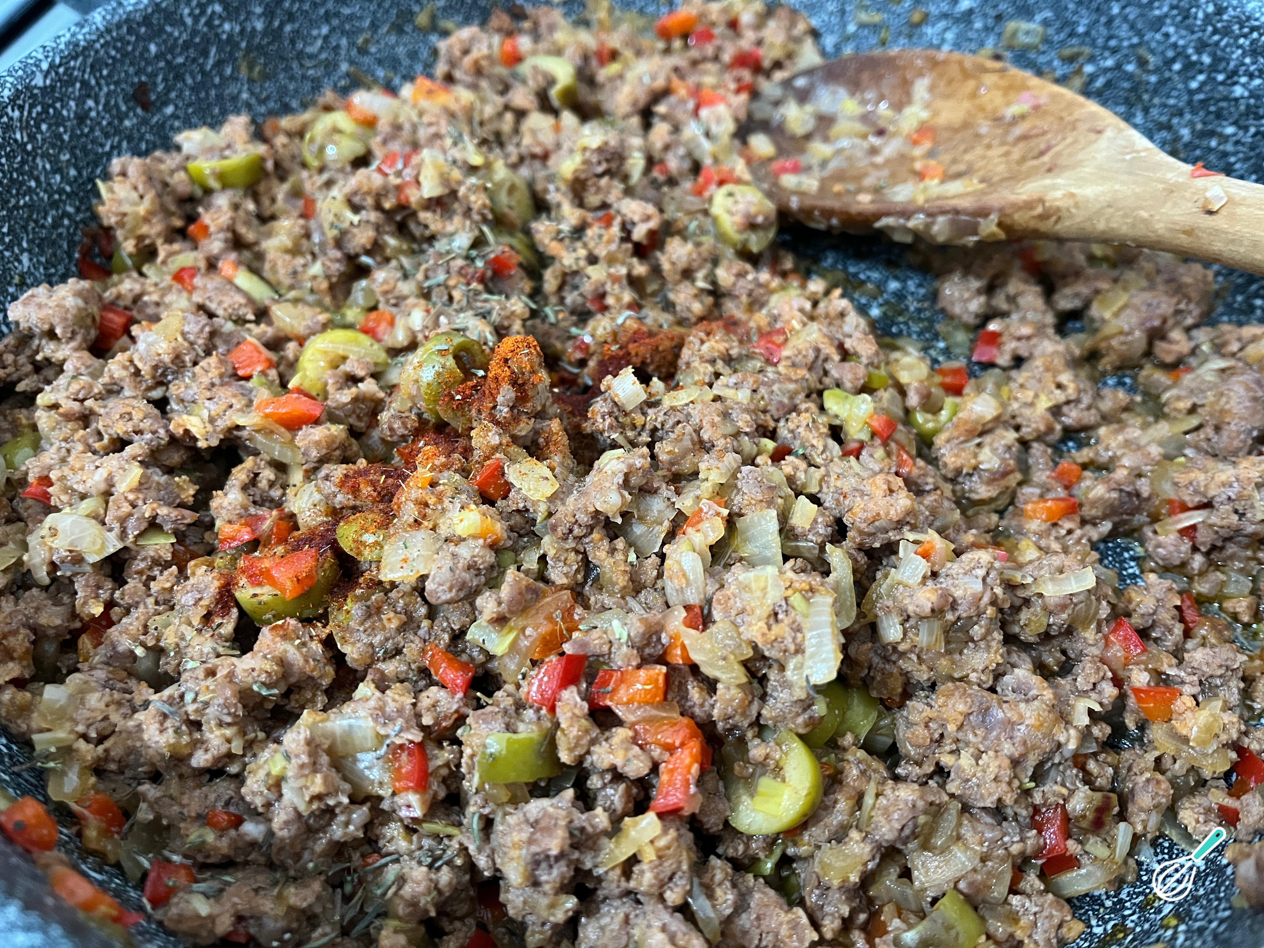 Quando a carne estiver dourada, acrescente novamente os legumes e desligue o fogo. Não se preocupe se a carne não estiver totalmente cozida, pois ela terminará de cozinhar no forno se necessário. Adicione também o tempero e as azeitonas fatiadas sem caroço.