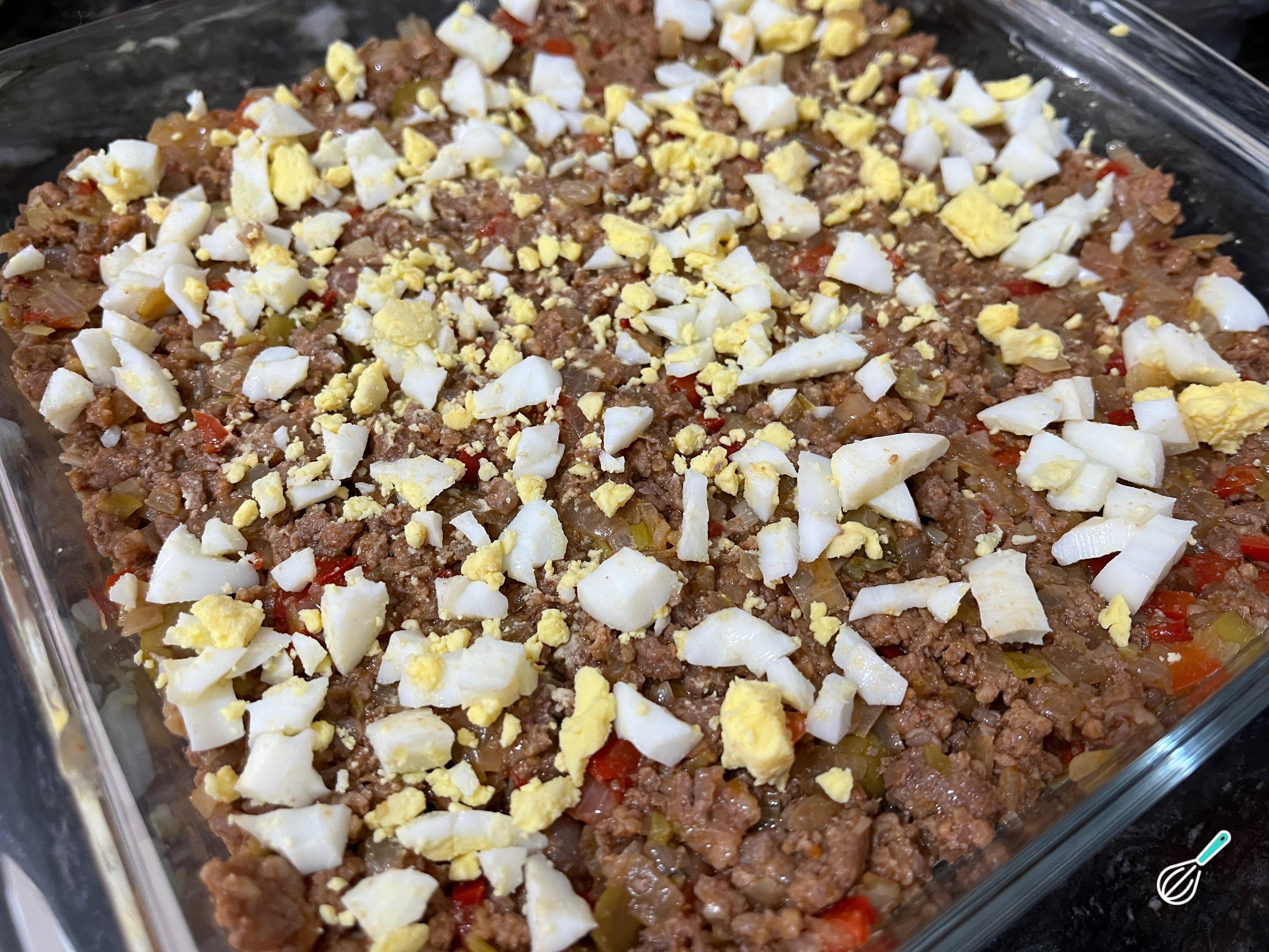 Leve o recheio para a forma onde deseja preparar e sirva o pastel de papas argentino, o meu é um quadrado de 20x20 centímetros. Distribua por toda a base da forma e coloque os ovos cozidos na carne. Reserve