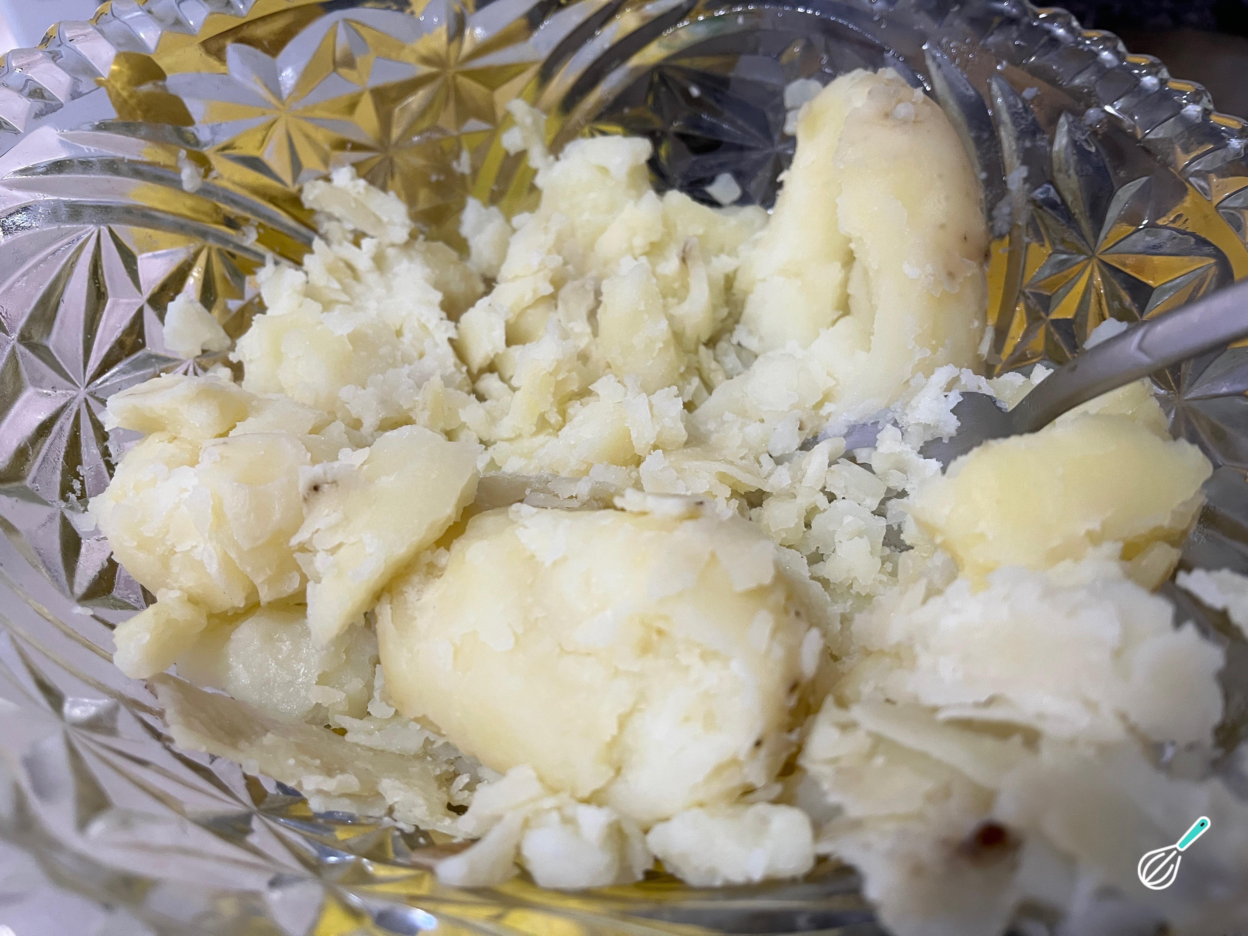 Por outro lado, descasque e amasse as batatas que cozinhou no início desta receita.