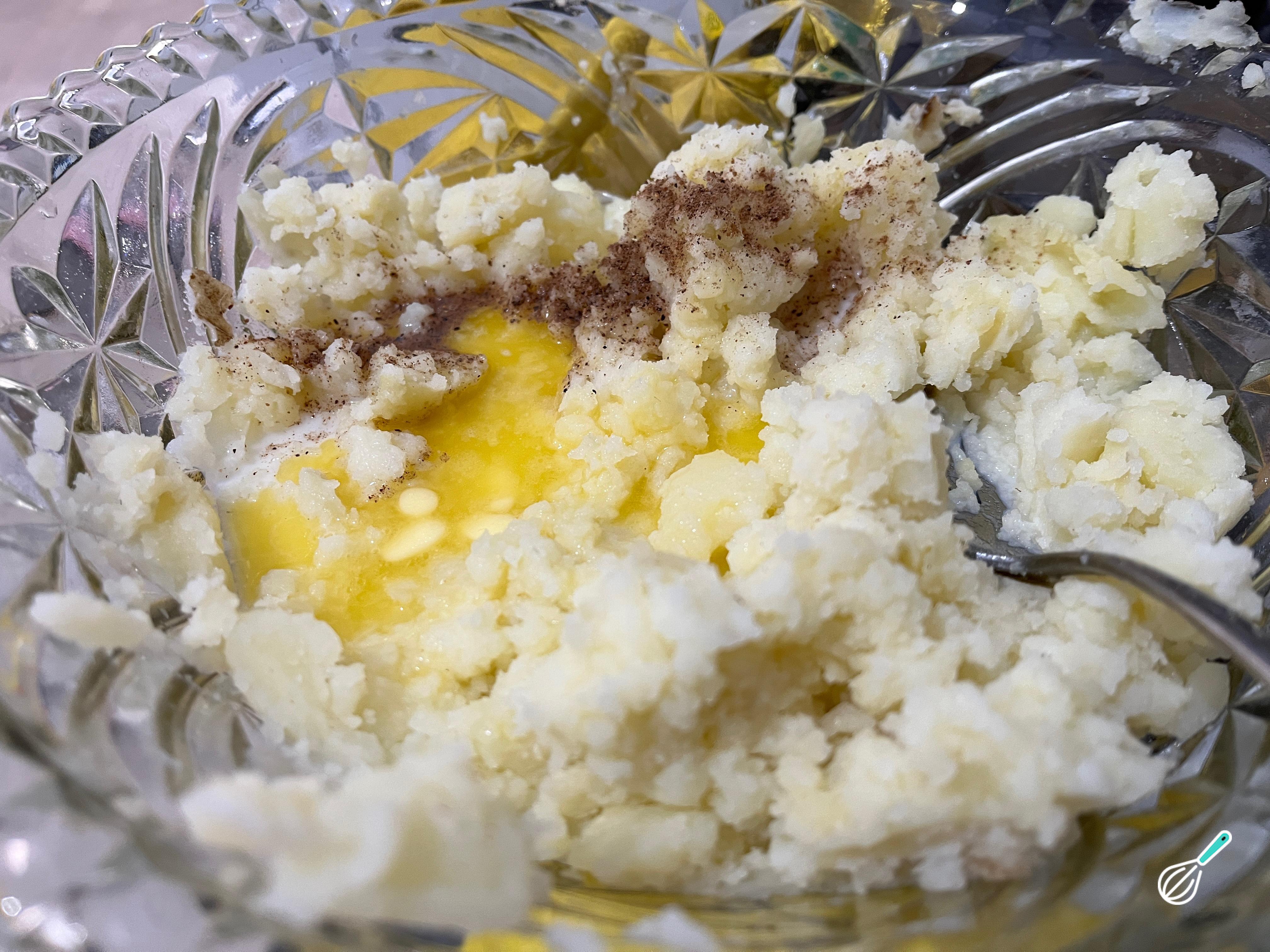 Quando estiverem frios tempere a gosto com noz moscada, manteiga e pimenta. Adicione o leite e verifique a consistência. Se estiver muito seco pode adicionar um pouco mais.